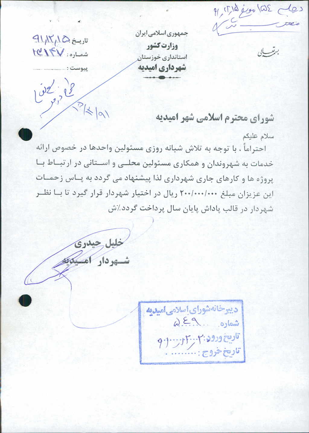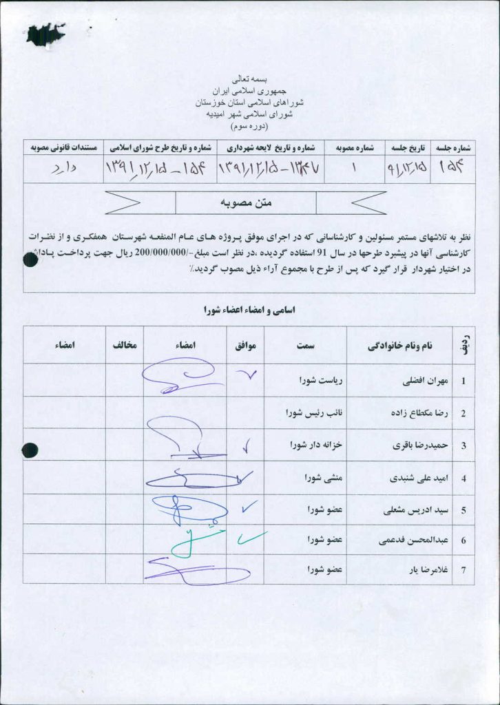 مصوبه شماره ۱ جلسه شماره ۱۵۴ مورخ ۹۱/۱۲/۱۵ شورای اسلامی شهر امیدیه