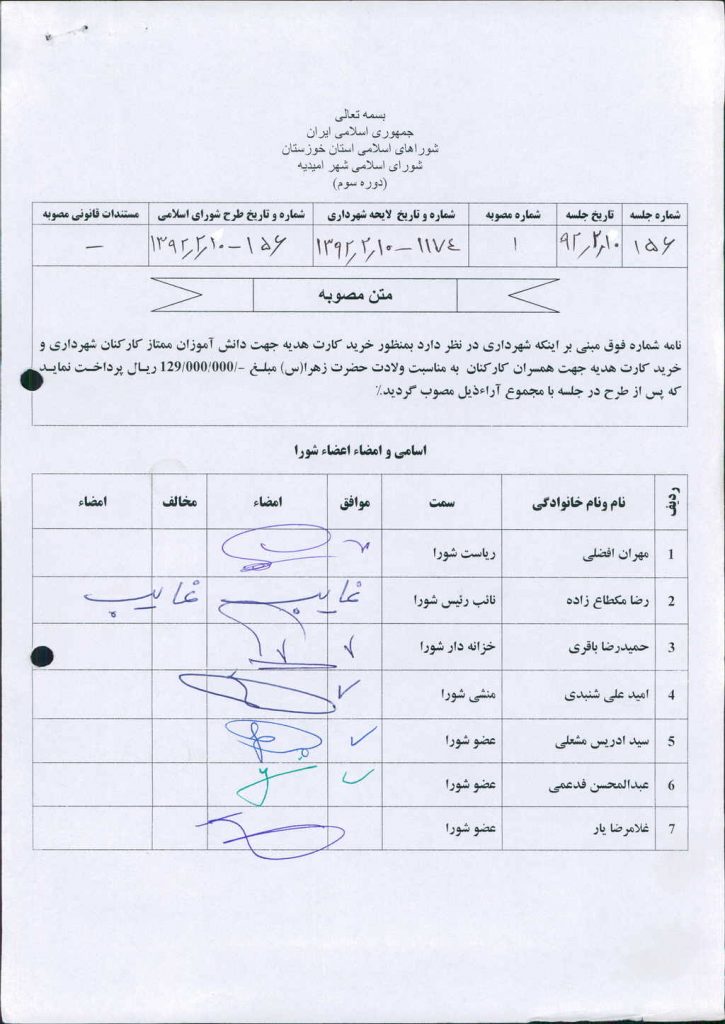 مصوبه شماره ۱ جلسه شماره ۱۵۶ شورای اسلامی شهر امیدیه