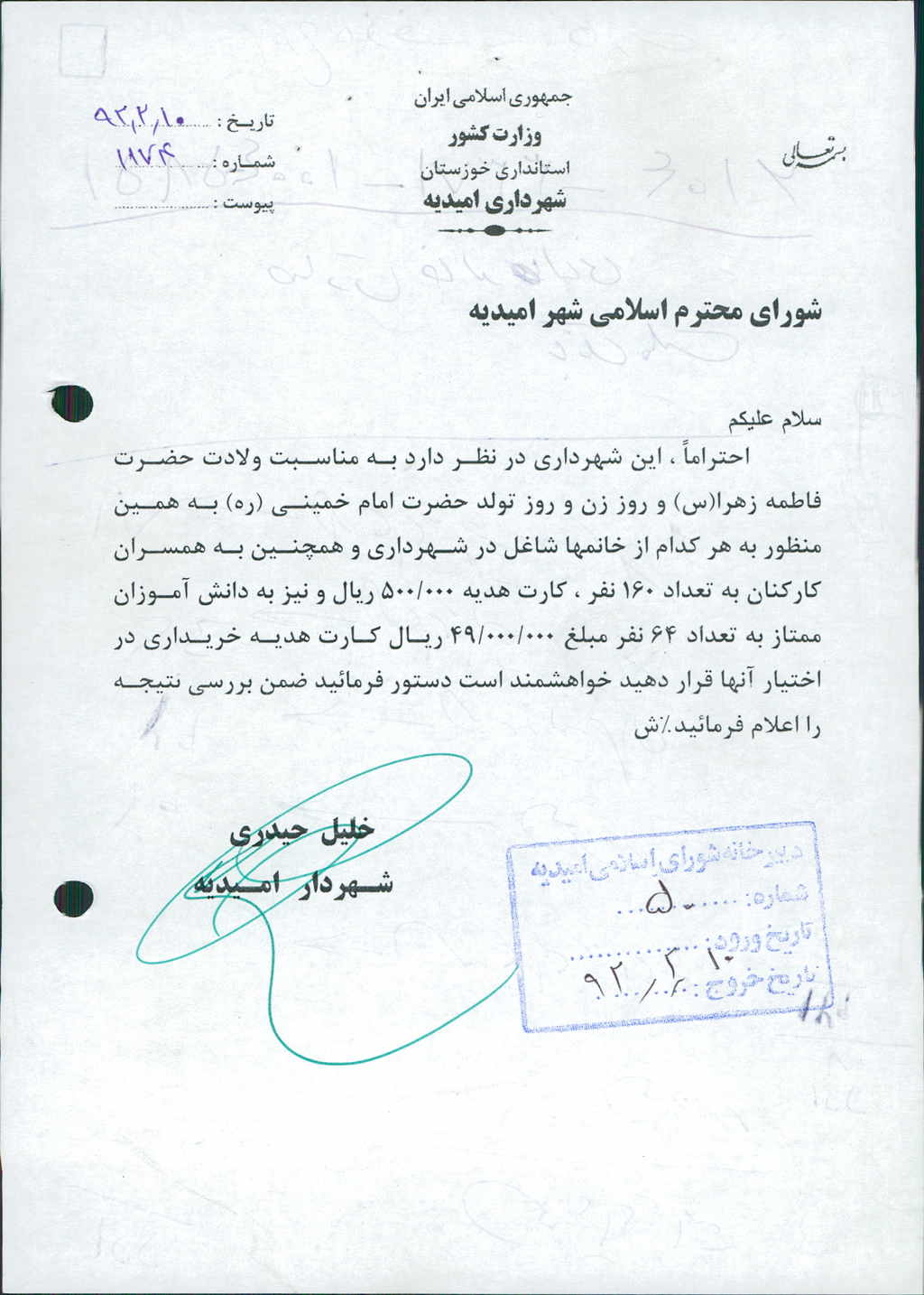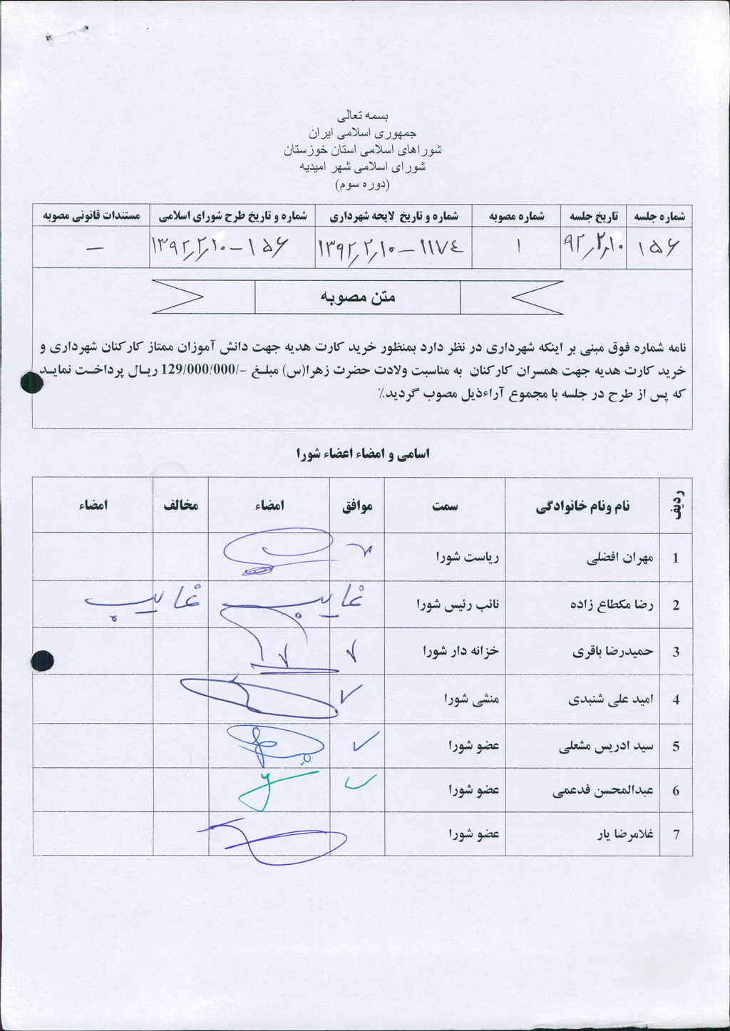 نامه شماره فوق مبنی بر اینکه شهرداری در نظر دارد بمنظور خرید کارت هدیه جهت دانش آموزان ممتاز کارکنان شهرداری و خرید کارت هدیه جهت همسران کارکنان به مناسبت ولادت حضرت زهرا(س) مبلغ -/۰۰۰/۰۰۰/ ۱۲۹ ریال پرداخت نماید که پس از طرح در جلسه با مجموع آراءذیل مصوب گردید%