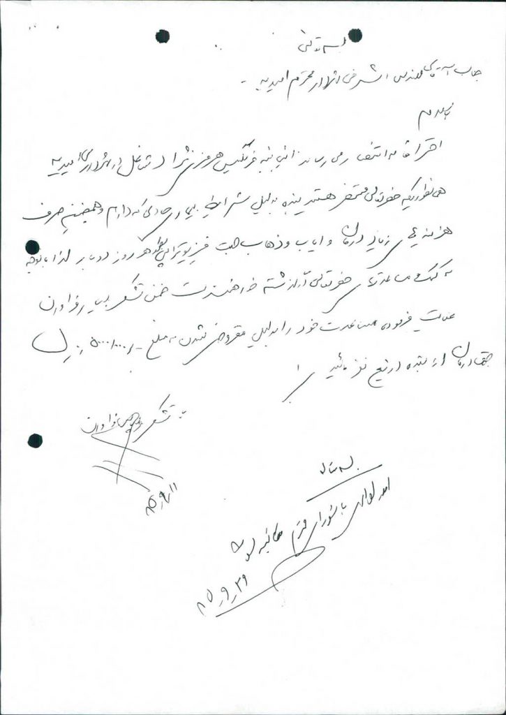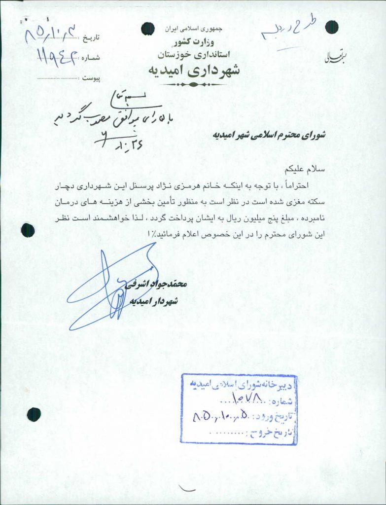 ۱-نامه شماره ۱۱۹۴۲-۳/ ۱۰/ ۸۵شهرداري درخصوص سكته مغزي خانم هرمزي نژاد از پرسنل شهرداري بود كه با ۶رأي موافق مقرر گرديد مبلغ -/۰۰۰/۰۰۰/ ۵ريال(پنج ميليون ريال)به ايشان مساعدت گردد.