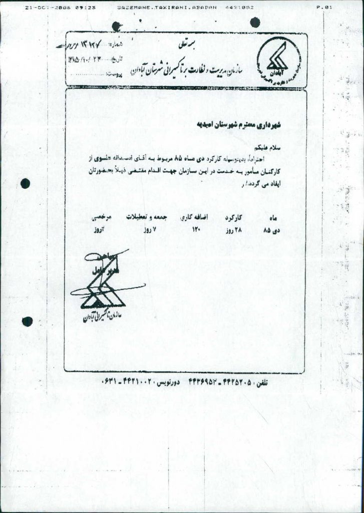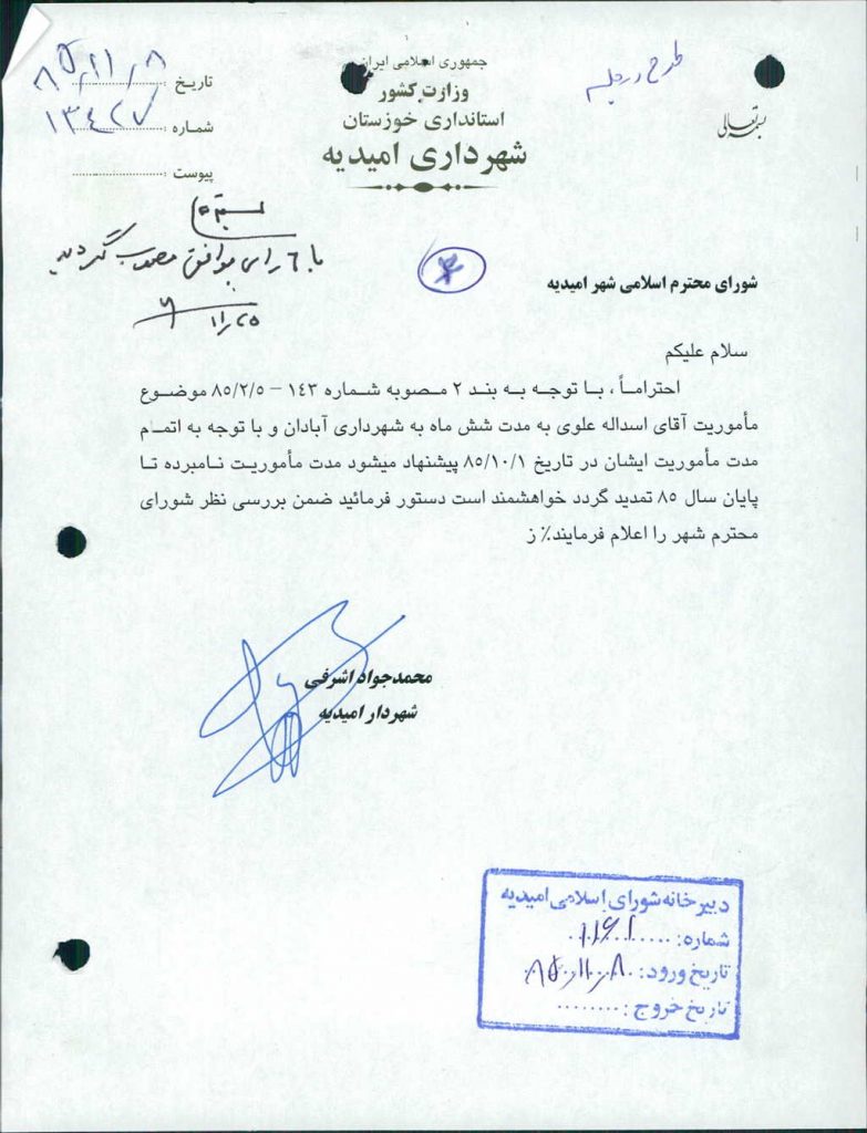 ۱-نامه شماره ۱۳۴۲۷مورخه ۸/ ۱۱/ ۸۵شهرداري درخصوص مأموريت آقاي اسدالله علوي به مدت ۶ ماه تا پايان سال ۸۵به شهرداري آبادان مطرح وبا ۶رأي موافق به تصويب رسيد.