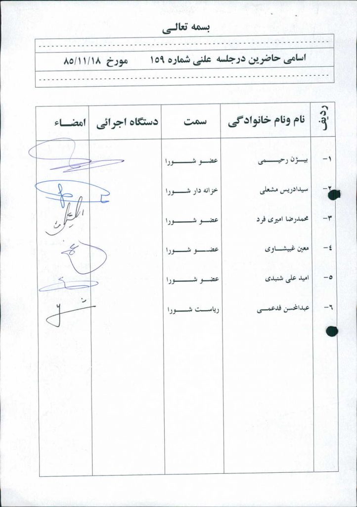 مصوبه شماره ۱ جلسه شماره ۱۵۹ مورخ ۸۵/۱۱/۱۸ شورای اسلامی شهر امیدیه