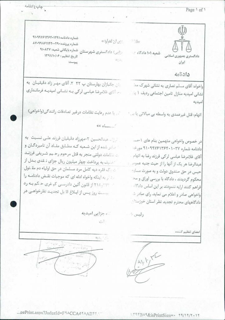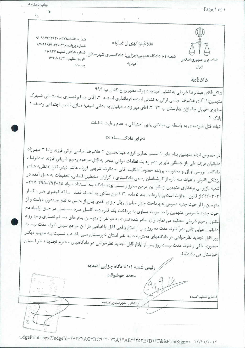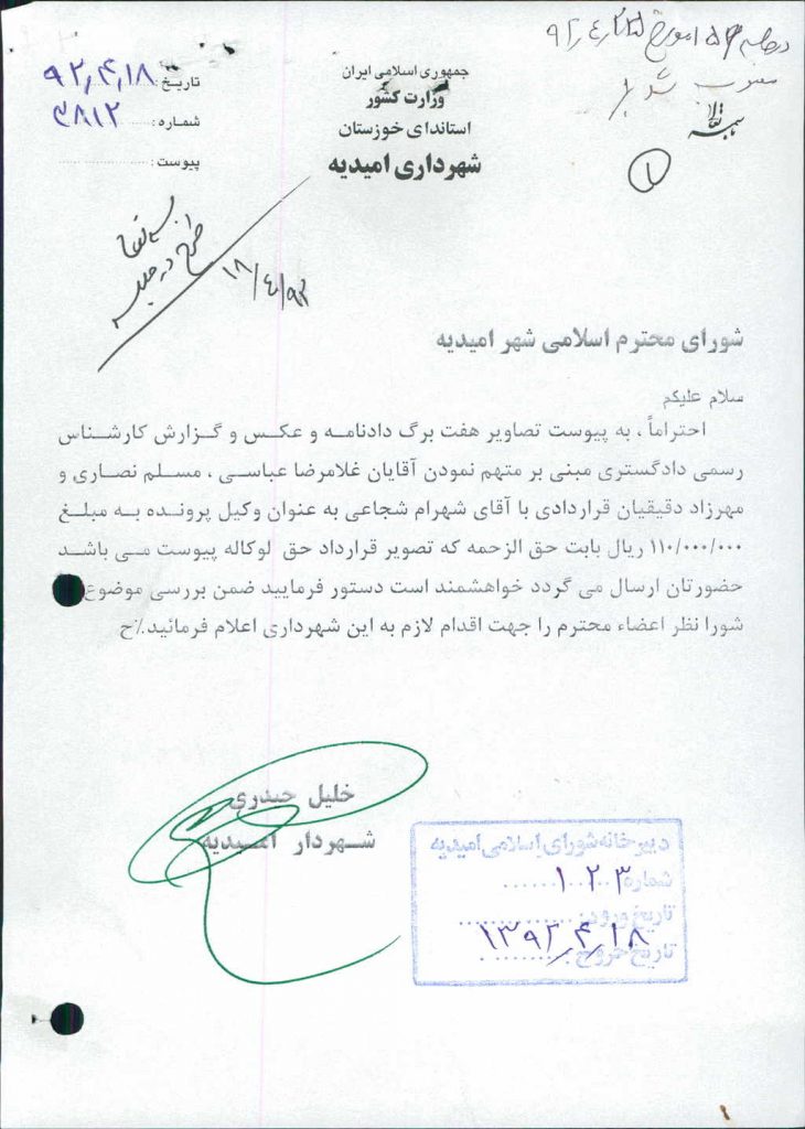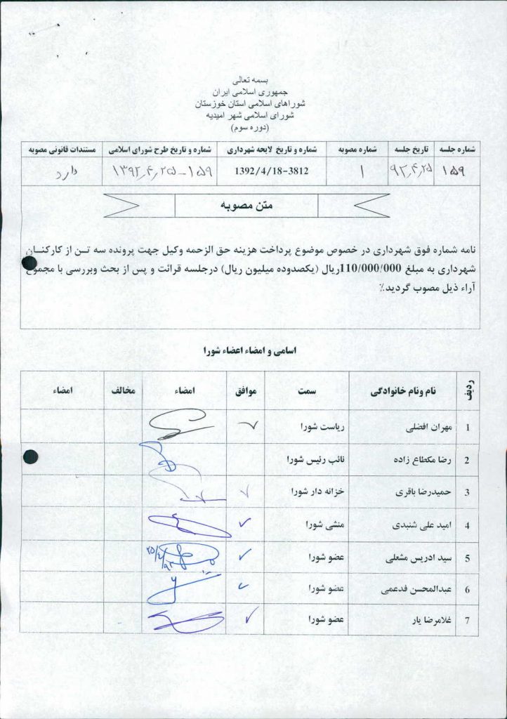 مصوبه شماره ۱ جلسه شماره ۱۵۹ شورای اسلامی شهر امیدیه