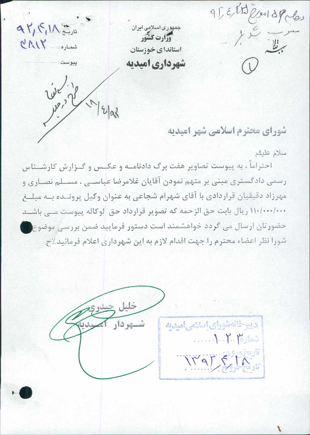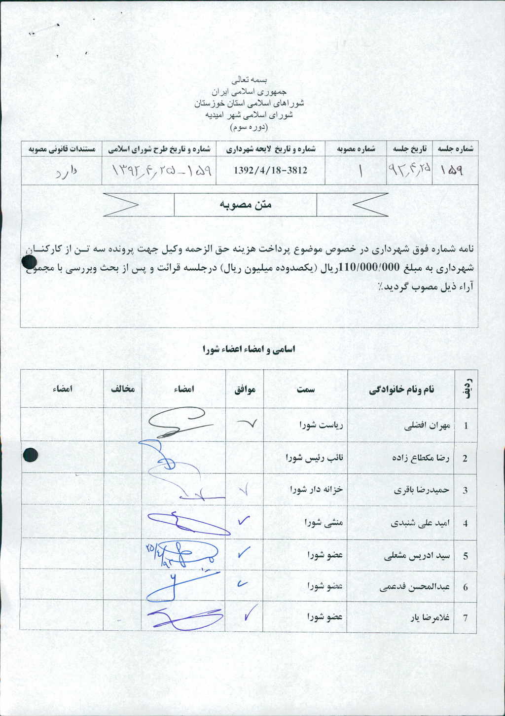 نامه شماره فوق شهرداری در خصوص موضوع پرداخت هزینه حق الزحمه وکیل جهت پرونده سه تن از کارکنان شهرداری به مبلغ ۰۰۰/۰۰۰/ ۱۱۰ريال (یکصدوده میلیون ريال) درجلسه قرائت و پس از بحث وبررسی با مجموع آراء ذیل مصوب گردید%