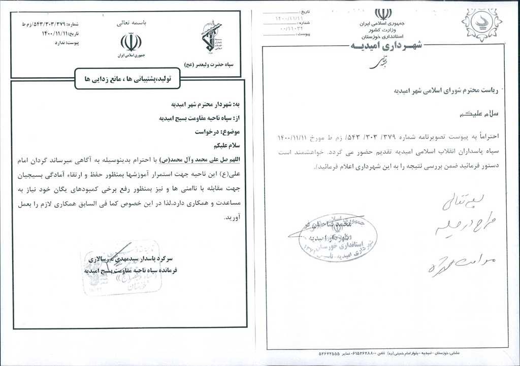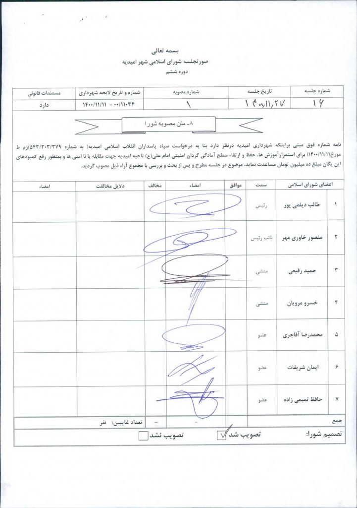 نامه شماره فوق مبنی براینکه شهرداری امیدیه درنظر دارد بنا به درخواست سپاه پاسداران انقلاب اسلامی امیدیه( به شماره ۳۷۹/ ۳۰۳/ ۵۴۳/زم ط مورخ۱۱/۱۱/ ۱۴۰۰) برای استمرارآموزش ها، حفظ و ارتقاء سطح آمادگی گردان امنیتی امام علی(ع) ناحیه امیدیه جهت مقابله با نا امنی ها و بمنظور رفع کمبودهای این یگان مبلغ ده میلیون تومان مساعدت نماید، موضوع در جلسه مطرح و پس از بحث و بررسی با مجموع آراء ذیل مصوب گردید.