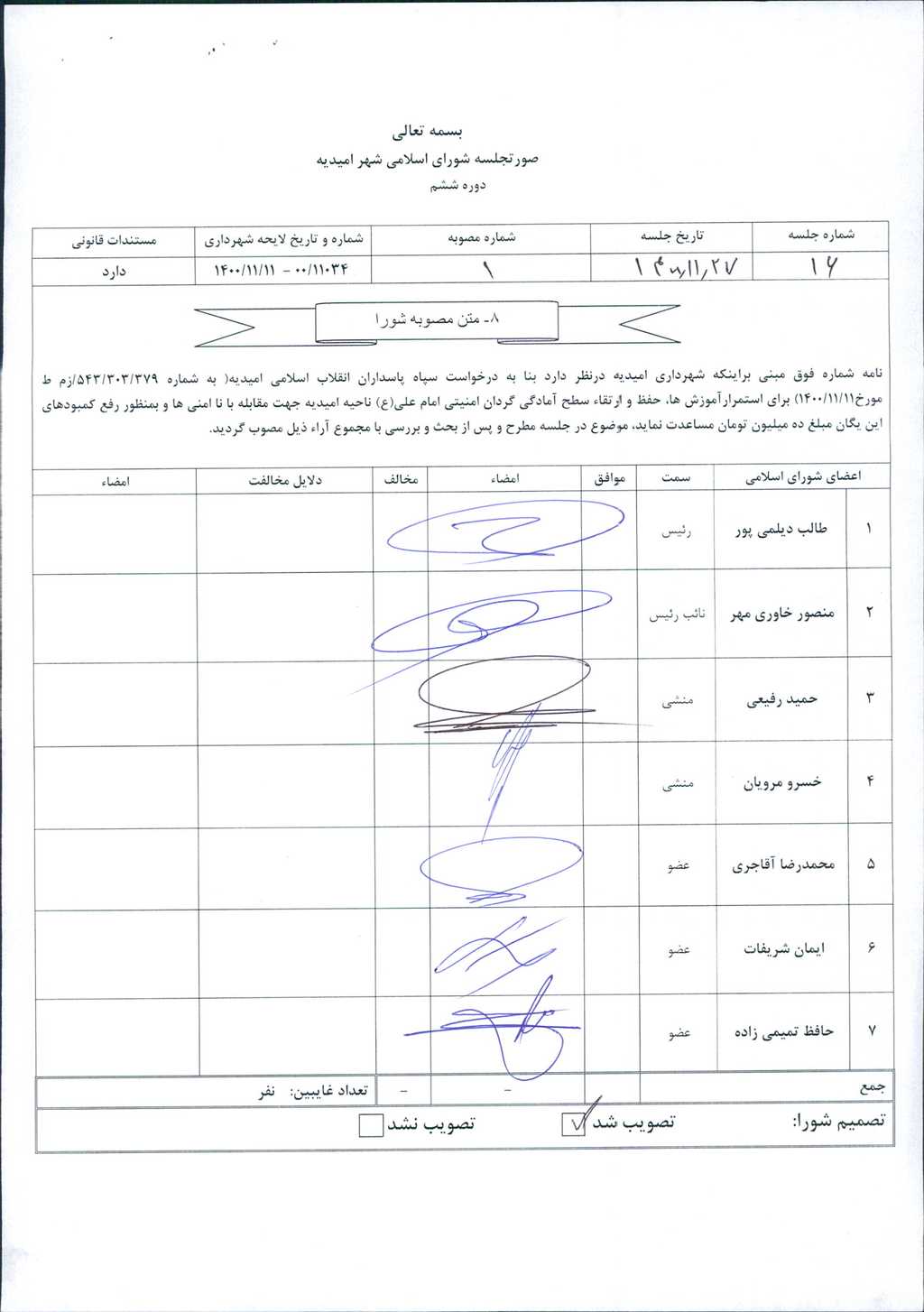 مصوبه شماره ۱ جلسه شماره ۱۶ شورای اسلامی شهر امیدیه