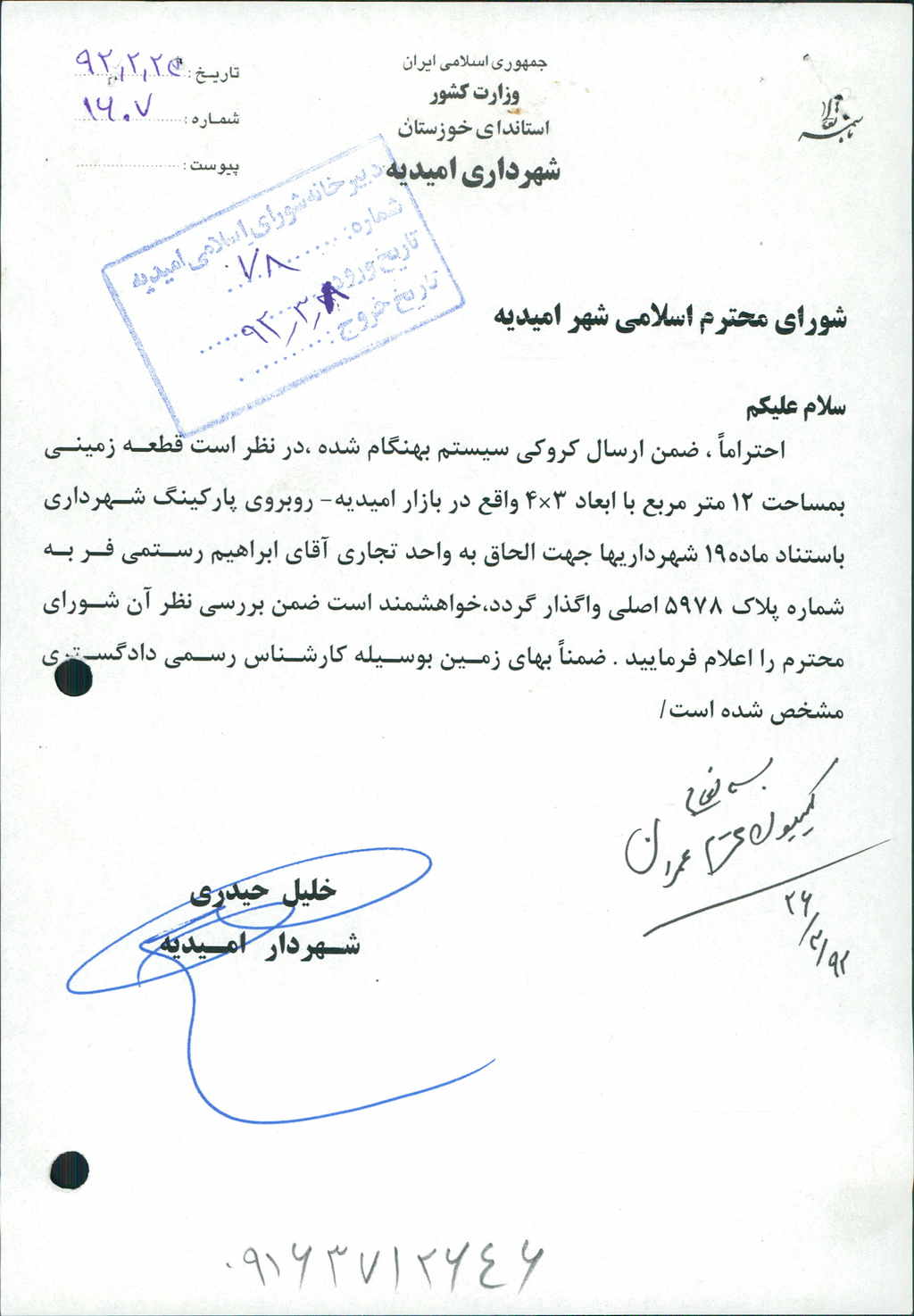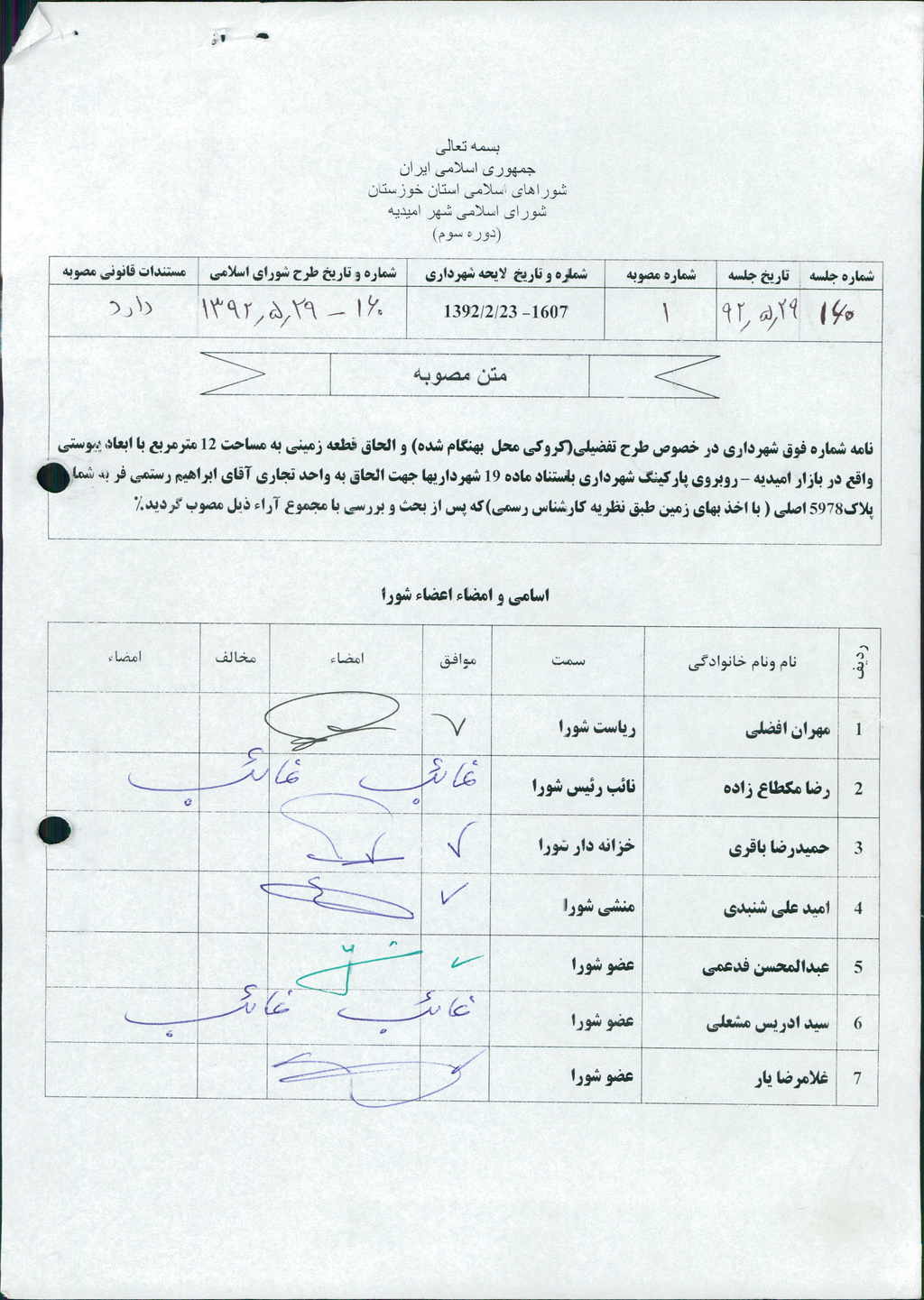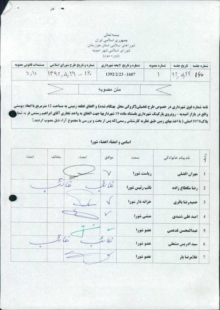 نامه شماره فوق شهرداری در خصوص طرح تفضیلی(کروکی محل بهنگام شده) و الحاق قطعه زمینی به مساحت ۱۲ مترمربع با ابعاد پیوستی واقع در بازار امیدیه – روبروی پارکینگ شهرداری باستناد ماده ۱۹ شهرداریها جهت الحاق به واحد تجاری آقای ابراهیم رستمی فر به شماره پلاک۵۹۷۸ اصلی ( با اخذ بهای زمین طبق نظریه کارشناس رسمی)که پس از بحث و بررسی با مجموع آراء ذیل مصوب گردید%
