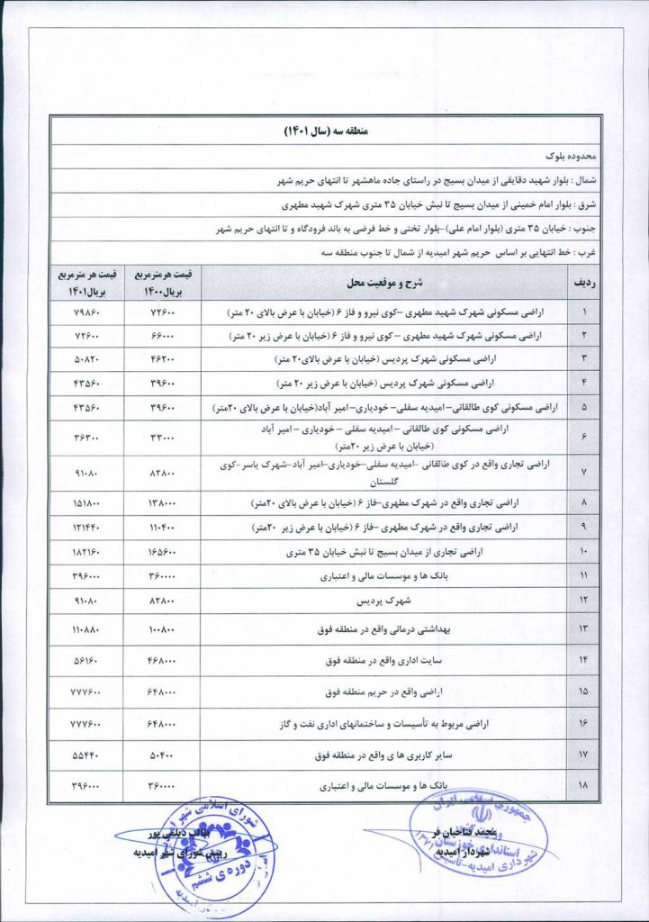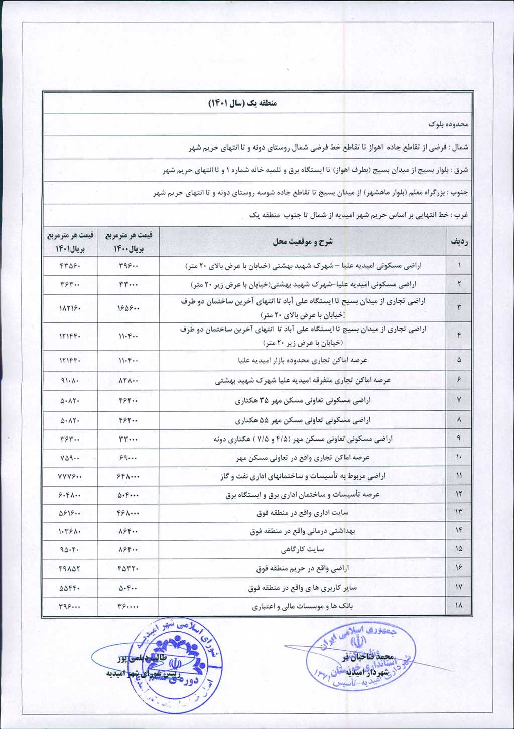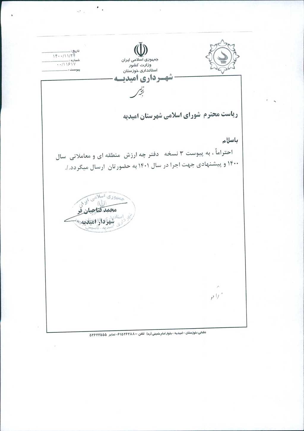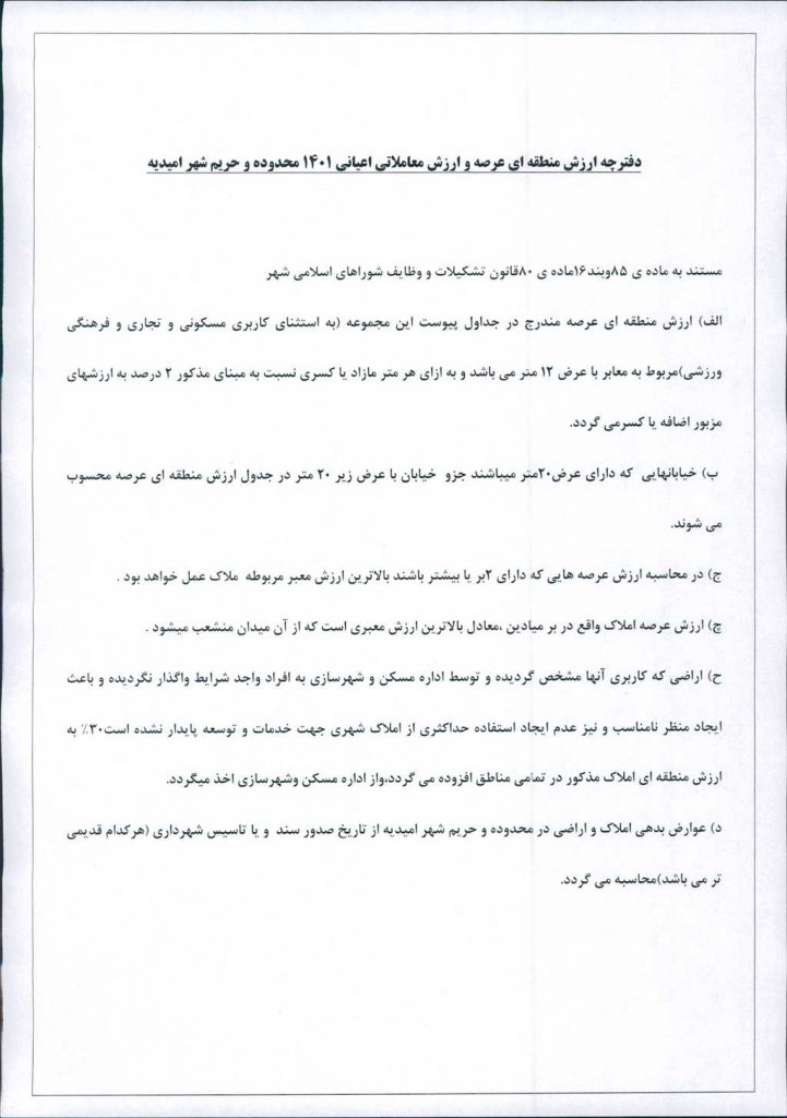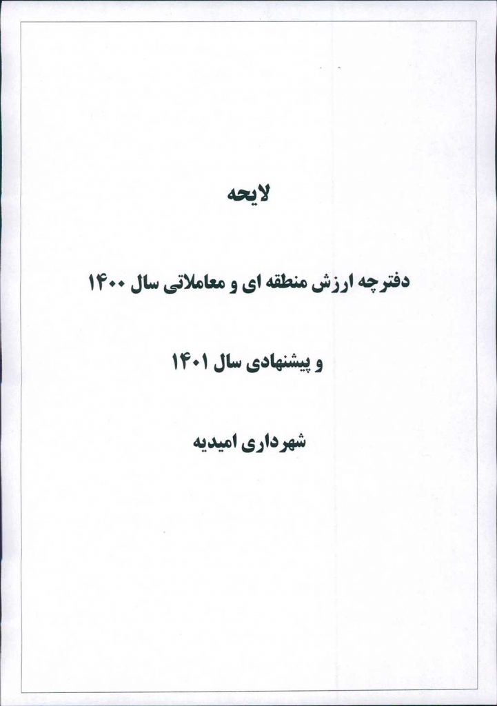 نامه شماره فوق شهرداری در خصوص یک جلد دفترچه ارزش منطقه ای عرصه و ارزش معاملاتی اعیانی محدوده و حریم شهر امیدیه مربوط به سال ۱۴۰۱ در جلسه مطرح و پس از بحث و بررسی با مجموع آراء ذیل مصوب گردید.