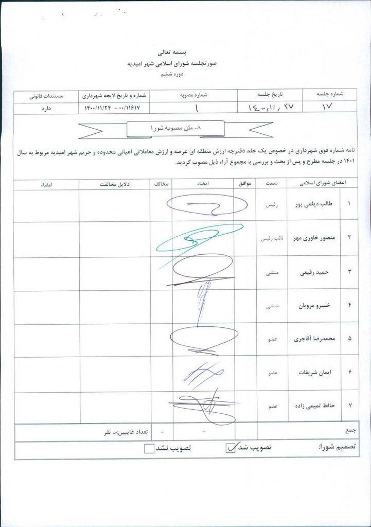 مصوبه شماره ۱ جلسه شماره ۱۷ شورای اسلامی شهر امیدیه