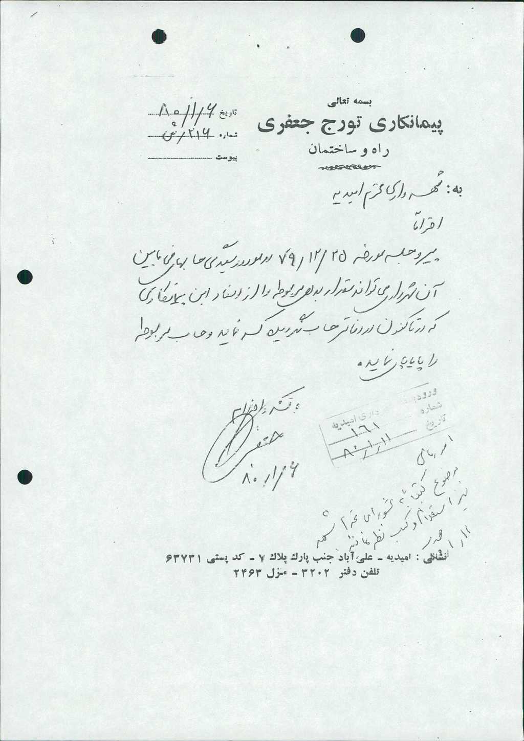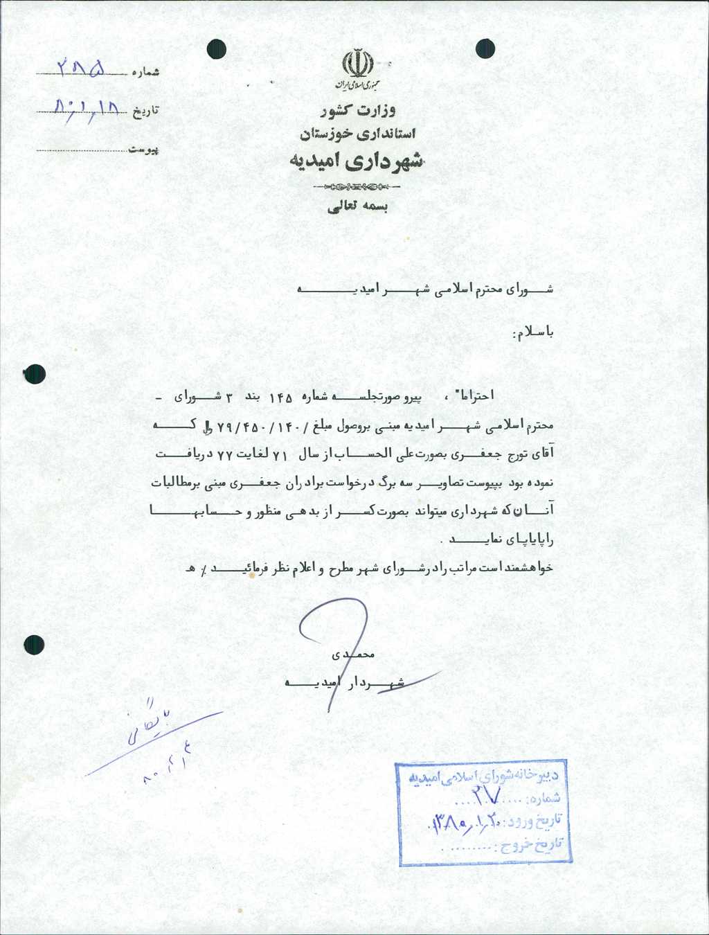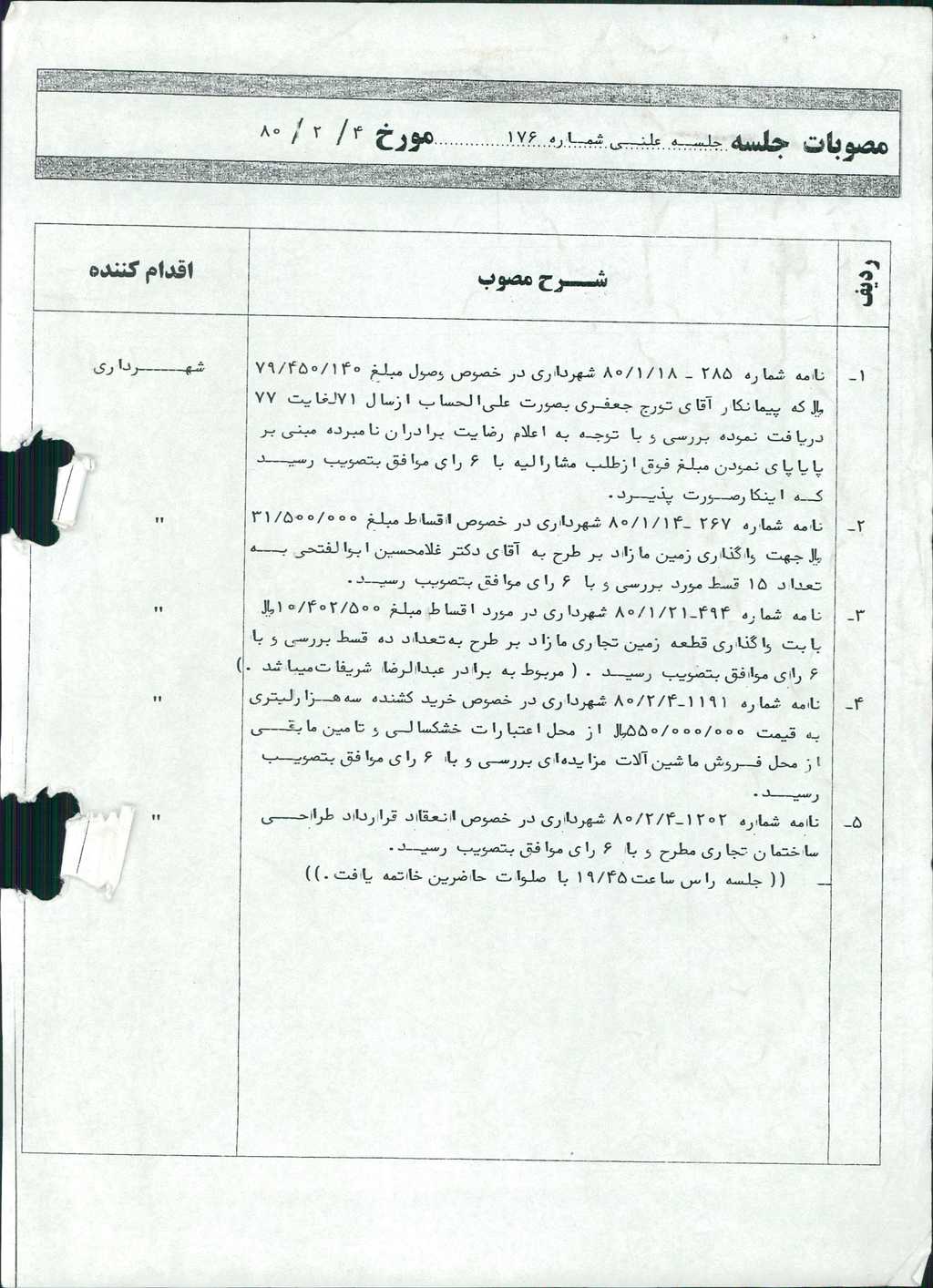 ۱-نامه شماره ۲۸۵ مورخه ۱۸/ ۱/ ۸۰ شهرداري در خصوص وصول مبلغ -/ ۱۴۰/ ۴۵۰/ ۷۹ ريال كه پيمانكار آقاي تورج جعفري بصورت علي الحساب از سال ۷۱ لغايت ۷۷ دريافت نموده بررسي و با توجه به اعلام رضايت برادران نامبرده مبني بر پاياپاي نمودن مبلغ فوق از طلب مشاراليه با ۶ رأي موافق بتصويب رسيد كه اينكار صورت پذيرد.
