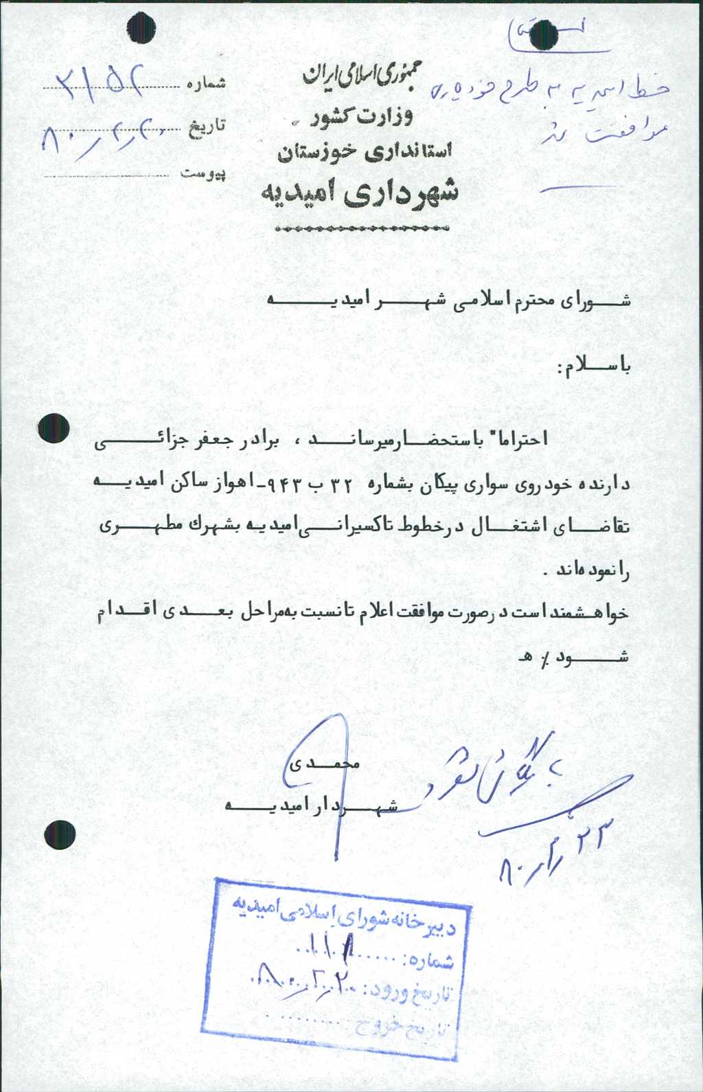 ۱-نامه شماره ۲۱۵۲-۲۰/ ۲/ ۸۰در خصوص تقاضای آقای جعفر جزایی دارنده خودرو سواری پیکان به شماره ۳۲ب ۹۴۳ با توجه به نیاز طرح خودیاری به تاکسی با ۶ رأی موافق به تصویب رسید.