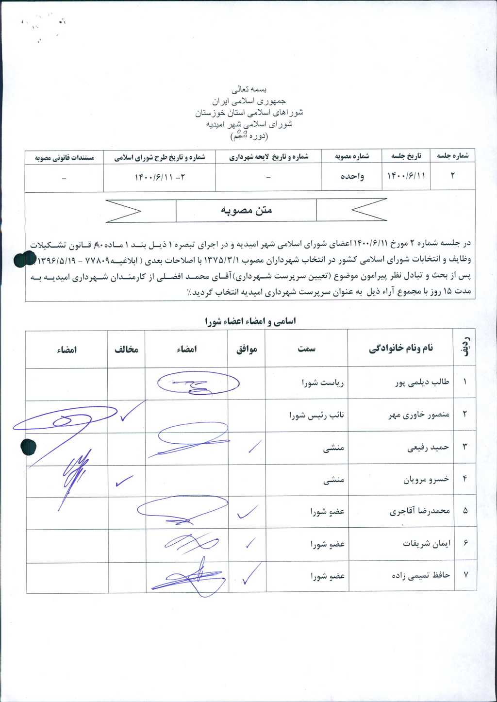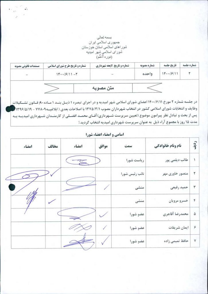 مصوبه شماره ۱ جلسه شماره ۲ شورای اسلامی شهر امیدیه