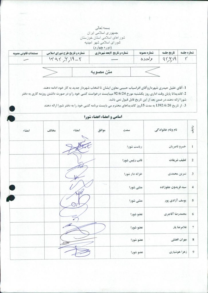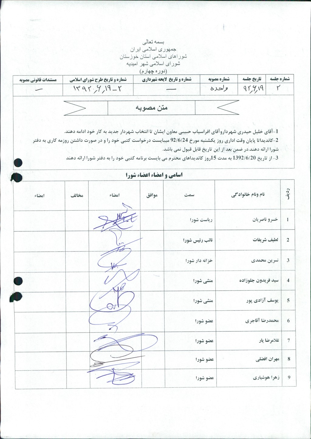 مصوبه شماره ۱ جلسه شماره ۲ شورای اسلامی شهر امیدیه