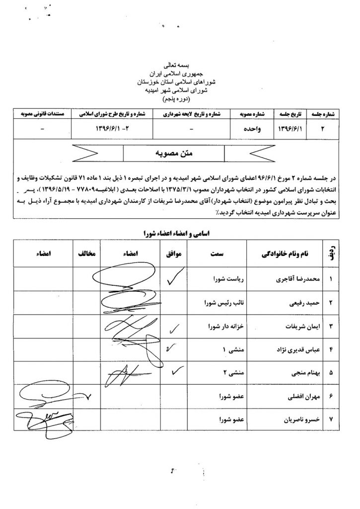 در جلسه شماره ۲ مورخ ۱/۶/۹۶ اعضای شورای اسلامی شهر امیدیه و در اجرای تبصره ۱ ذیل بند ۱ ماده ۷۱ قانون تشکیلات وظایف و انتخابات شورای اسلامی کشور در انتخاب شهرداران مصوب ۱/۳/۱۳۷۵ با اصلاحات بعدی ( ابلاغیه۷۷۸۰۹ – ۱۹/۵/۱۳۹۶ )، پس از بحث و تبادل نظر پیرامون موضوع (انتخاب شهردار)آقای محمدرضا شریفات از کارمندان شهرداری امیدیه با مجموع آراء ذیل به عنوان سرپرست شهرداری امیدیه انتخاب گردید%