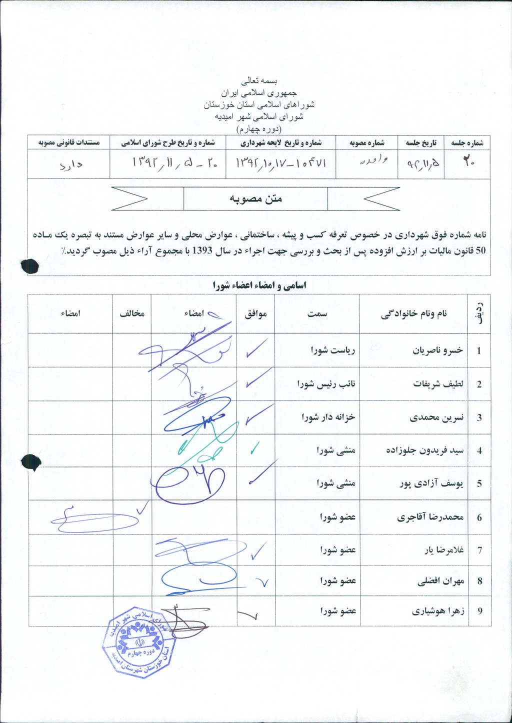 مصوبه شماره ۱ جلسه شماره ۲۰ شورای اسلامی شهر امیدیه
