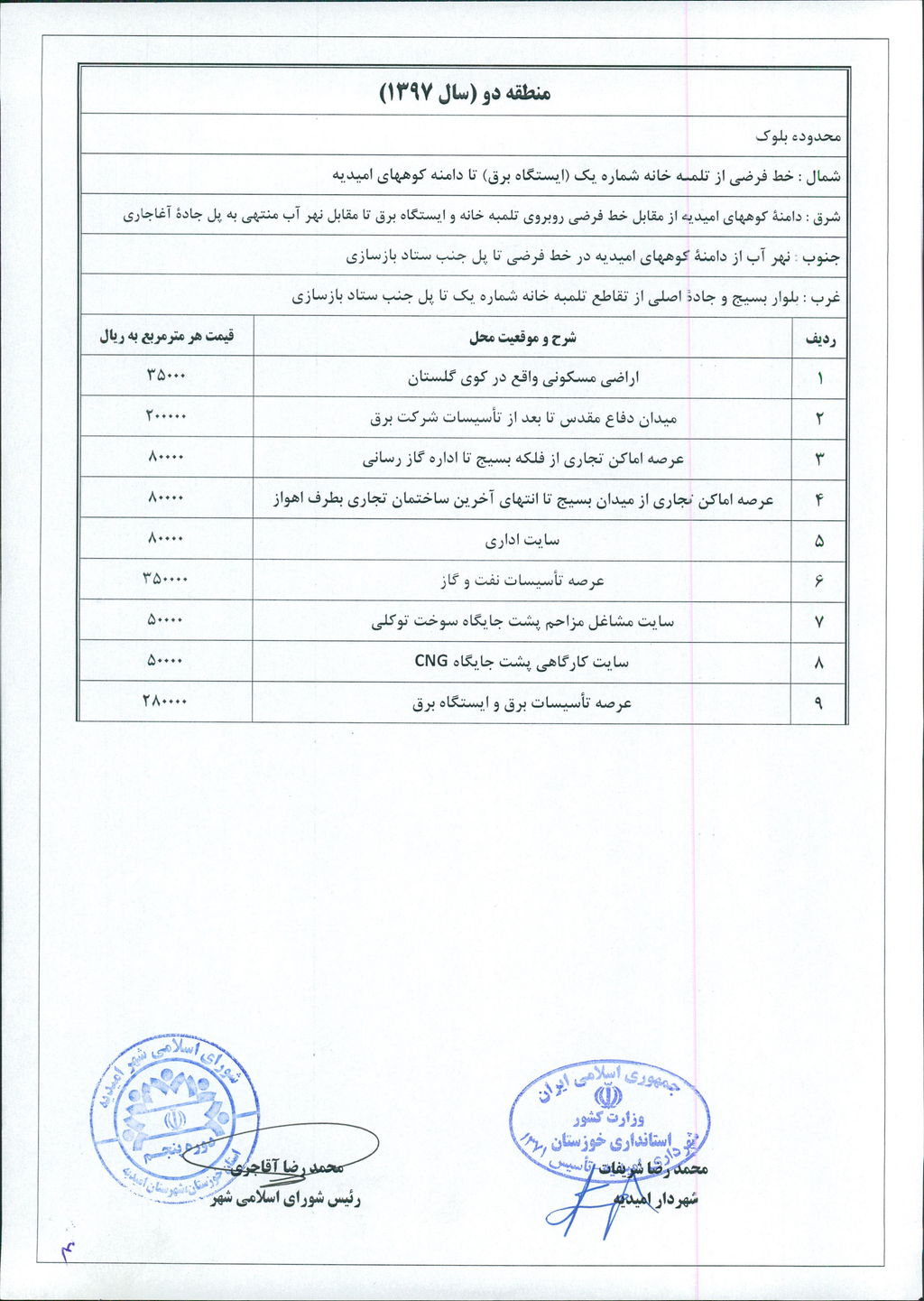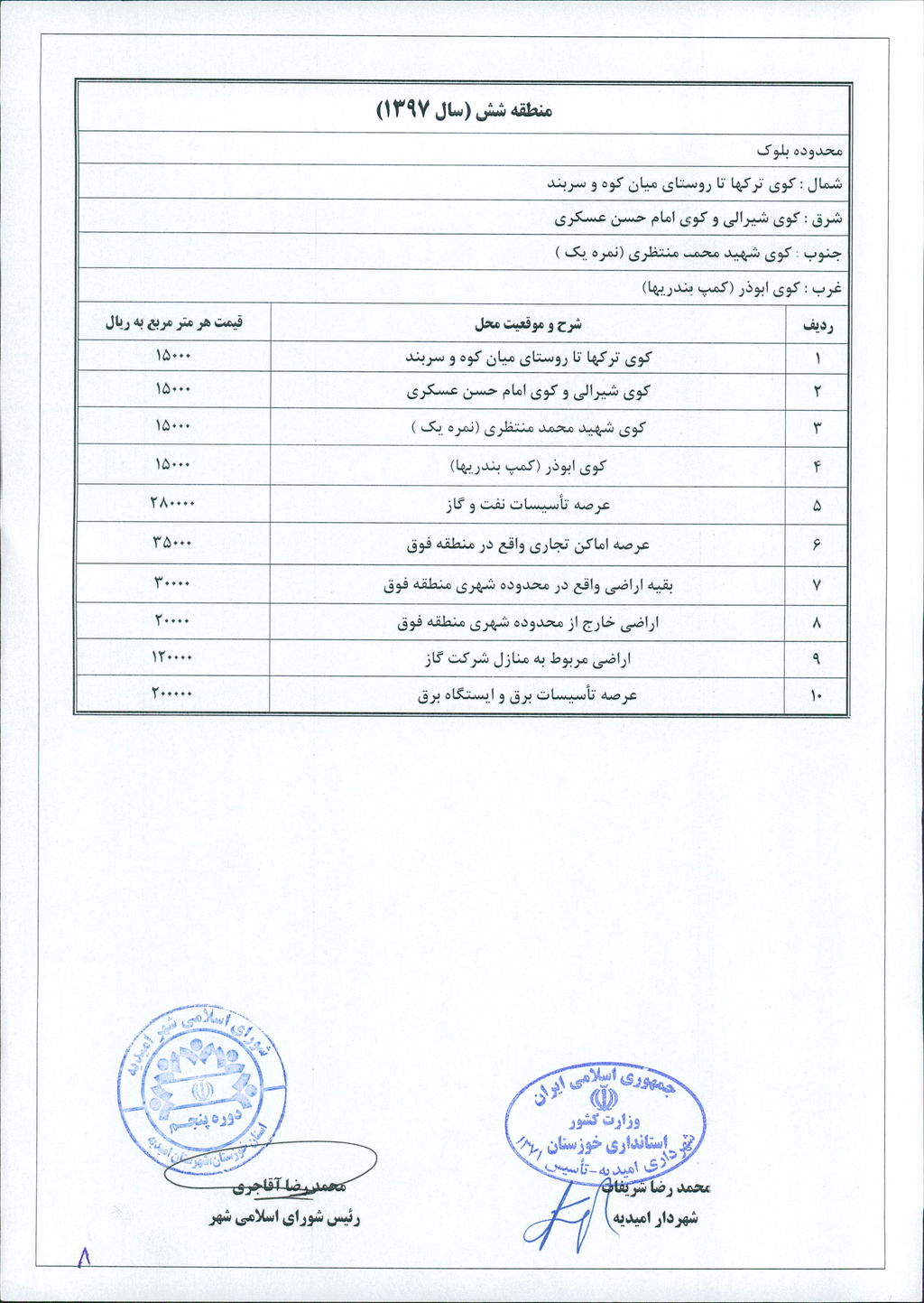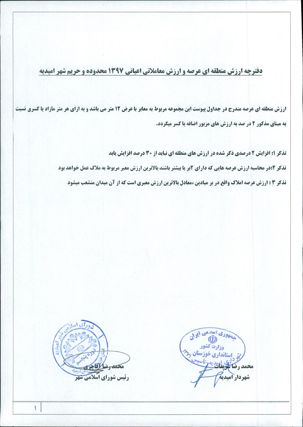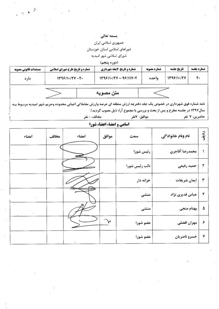 مصوبه شماره ۱ جلسه شماره ۲۰ مورخ۹۶/۱۰/۲۷ شورای اسلامی شهر امیدیه