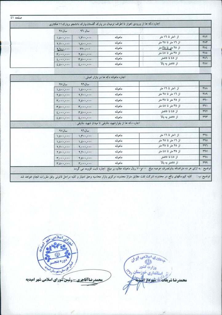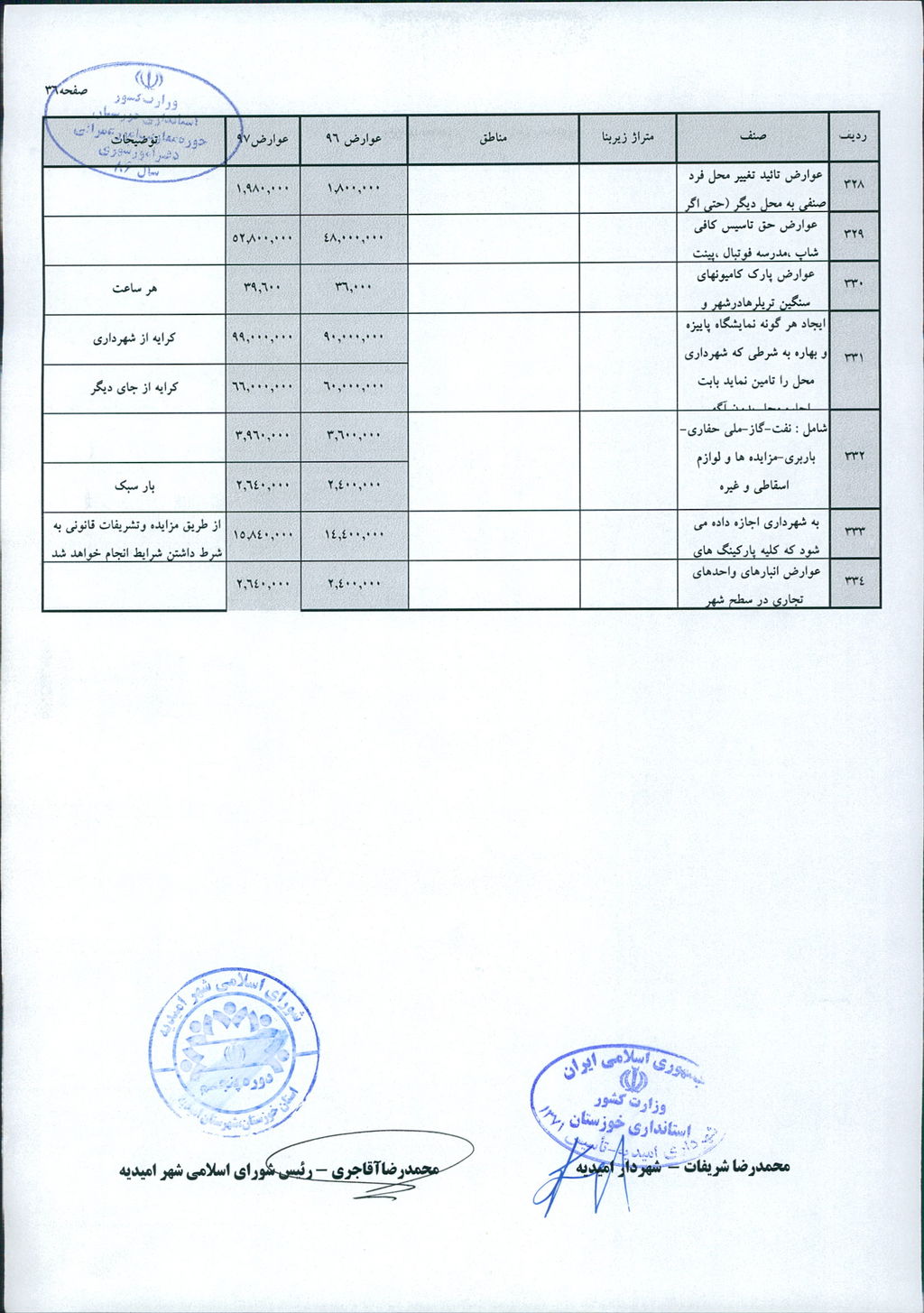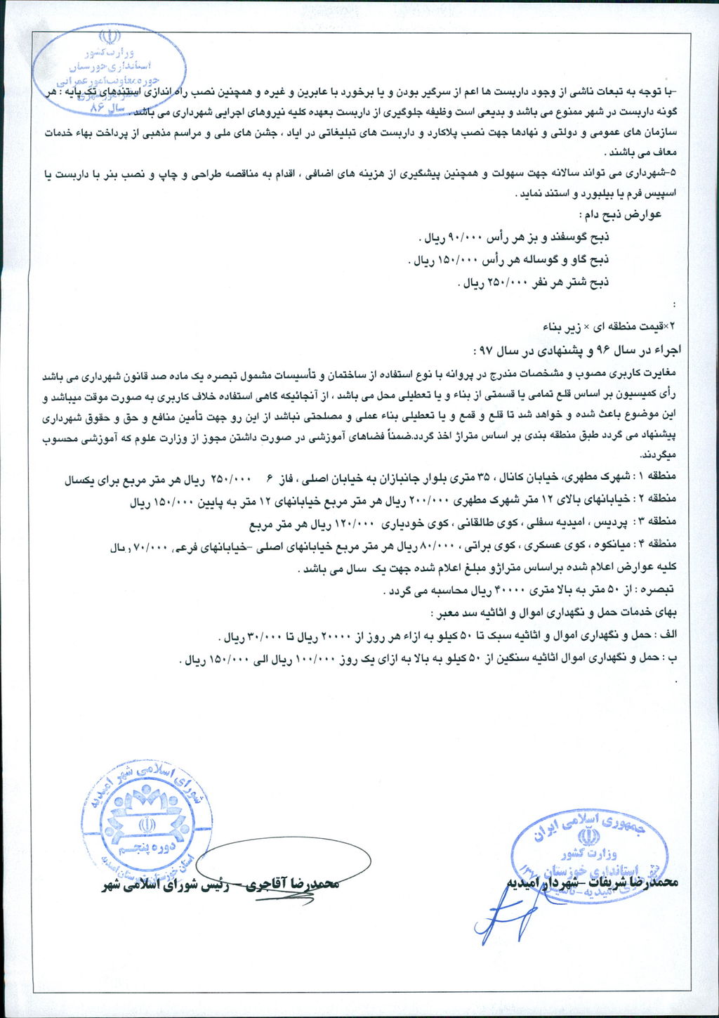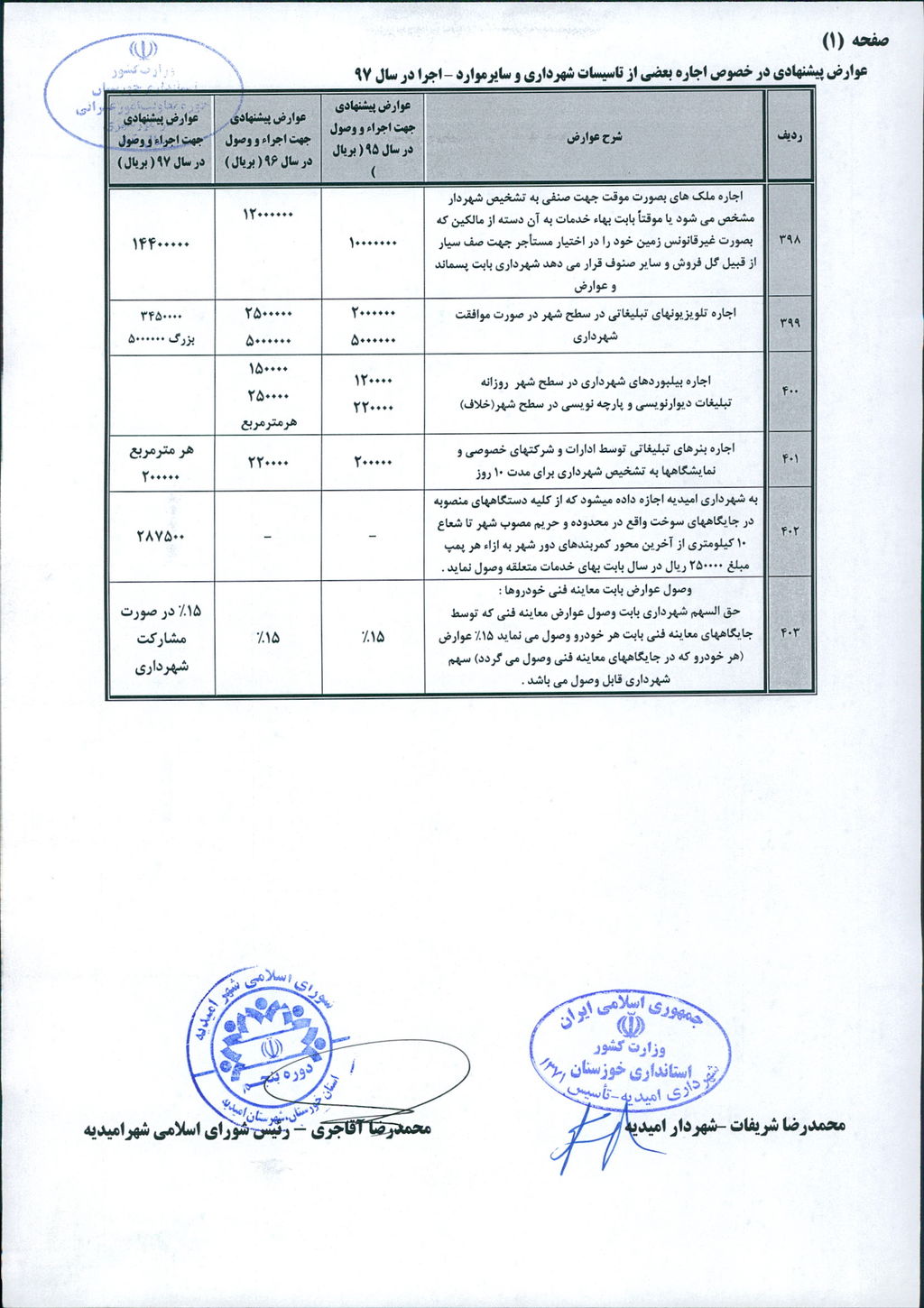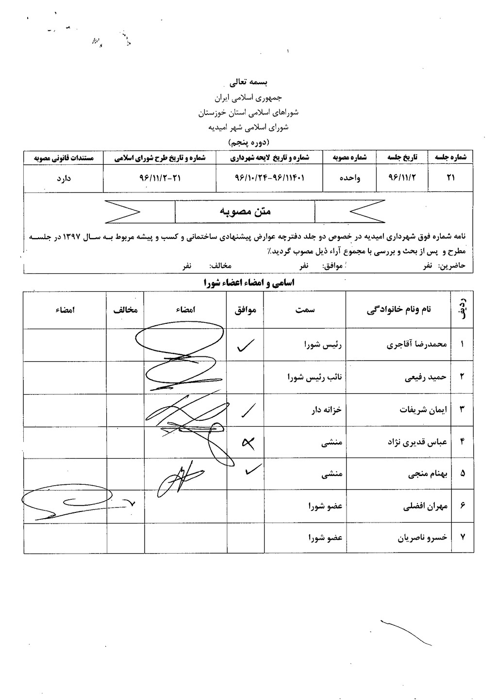 مصوبه شماره ۱ جلسه شماره ۲۱ مورخ ۹۶/۱۱/۲ شورای اسلامی شهر امیدیه