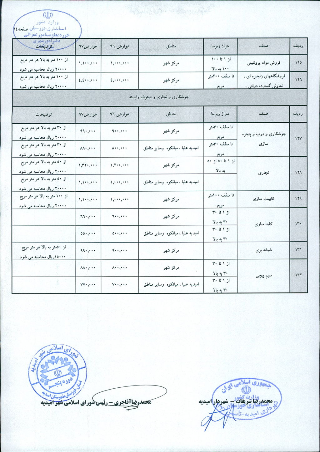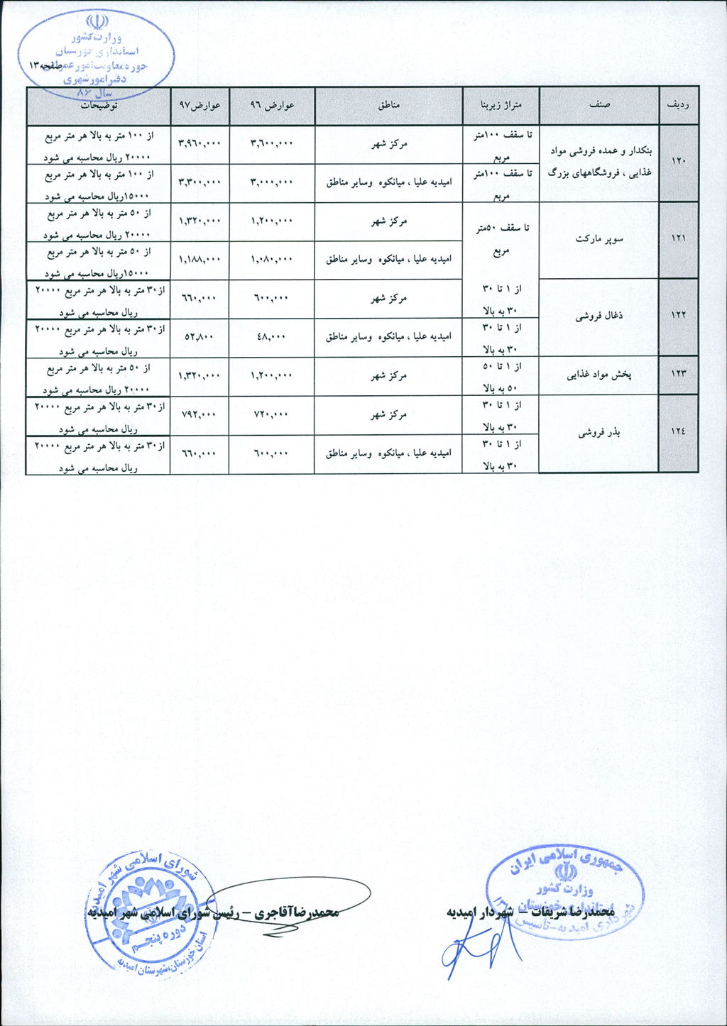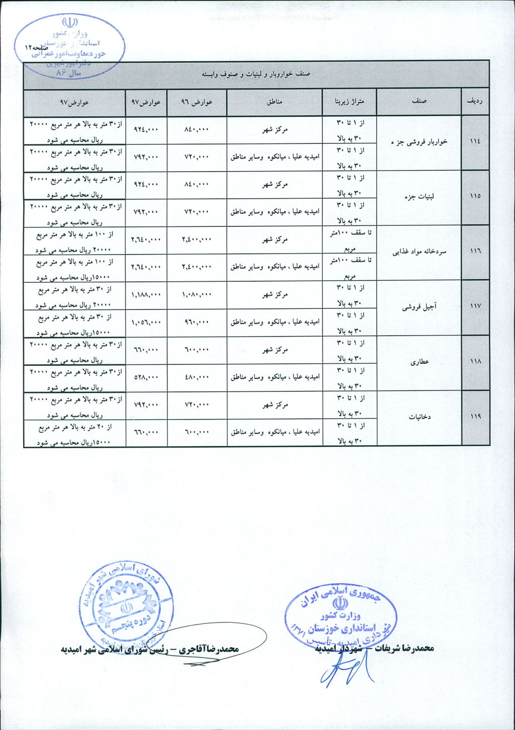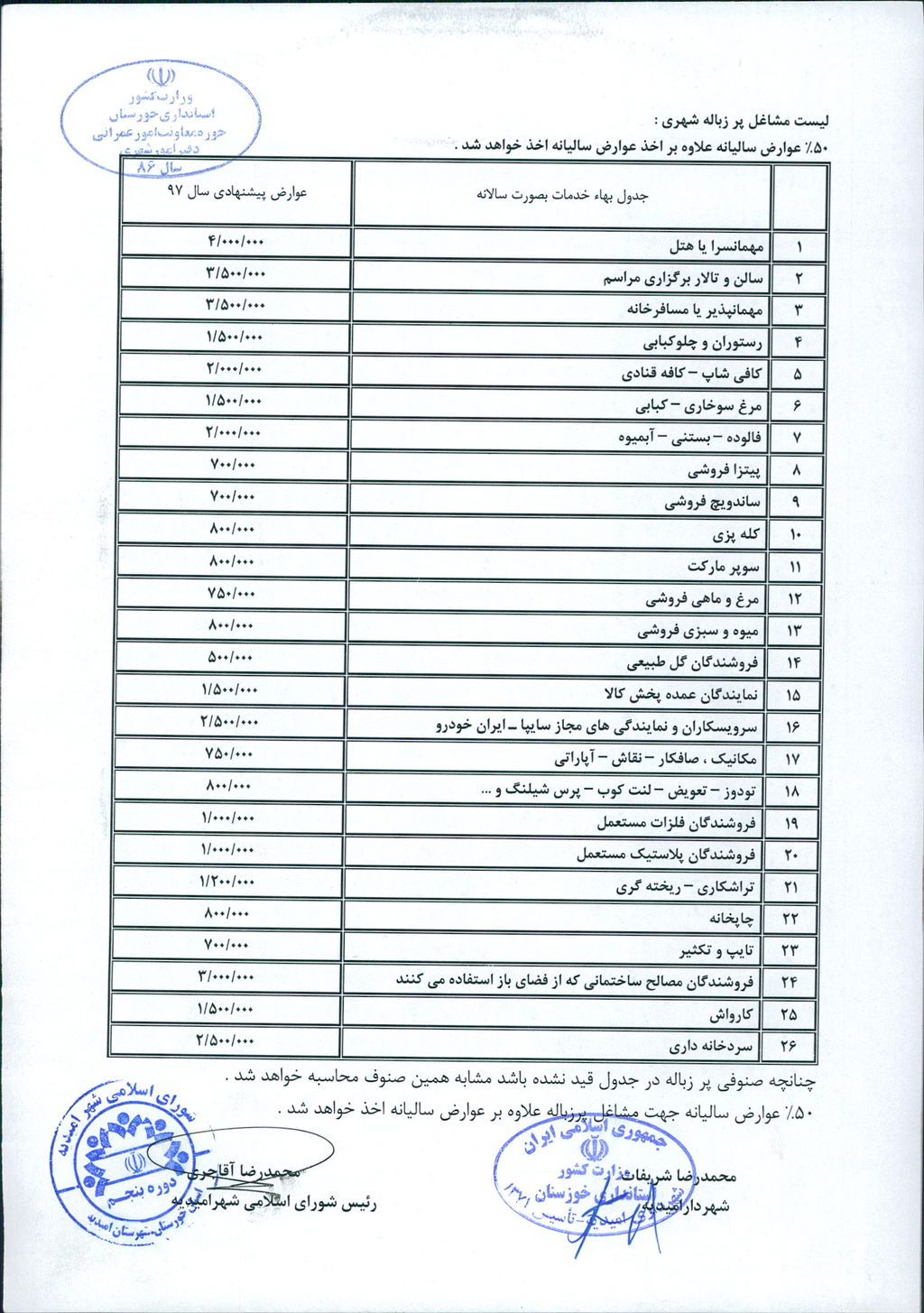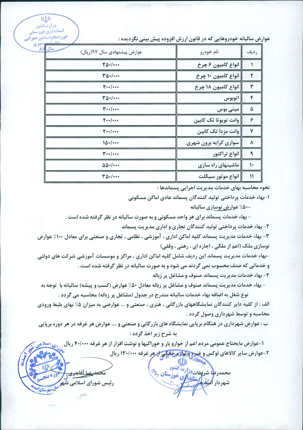 نامه شماره فوق شهرداری امیدیه در خصوص دو جلد دفترچه عوارض پیشنهادی ساختمانی و کسب و پیشه مربوط به سال ۱۳۹۷ در جلسه مطرح و پس از بحث و بررسی با مجموع آراء ذیل مصوب گردید%