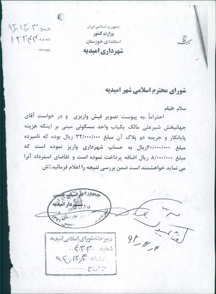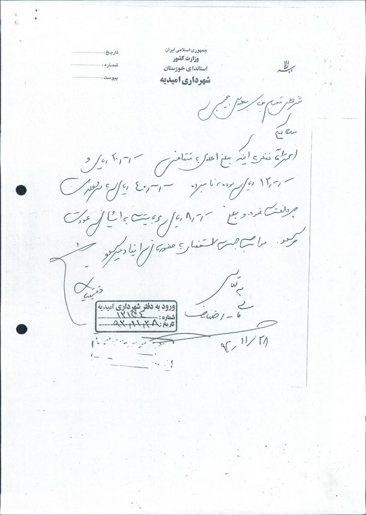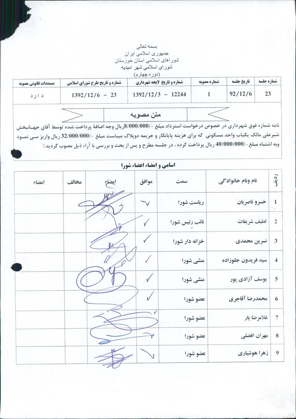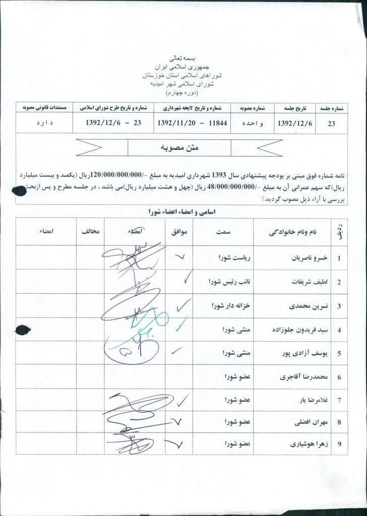 مصوبه شماره ۱ جلسه شماره ۲۳ شورای اسلامی شهر امیدیه