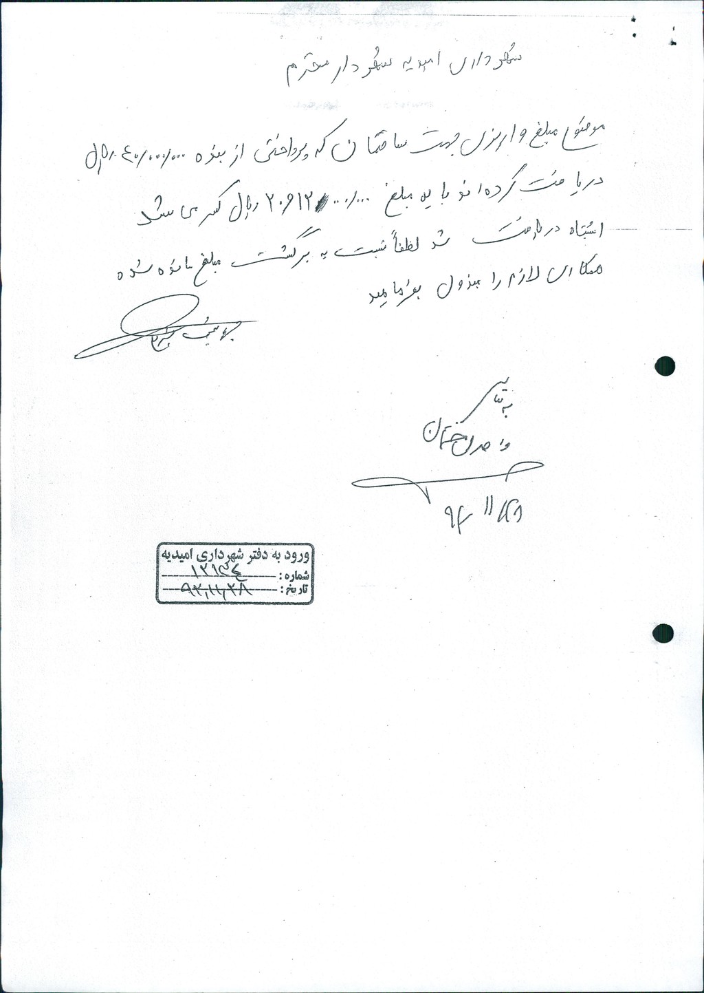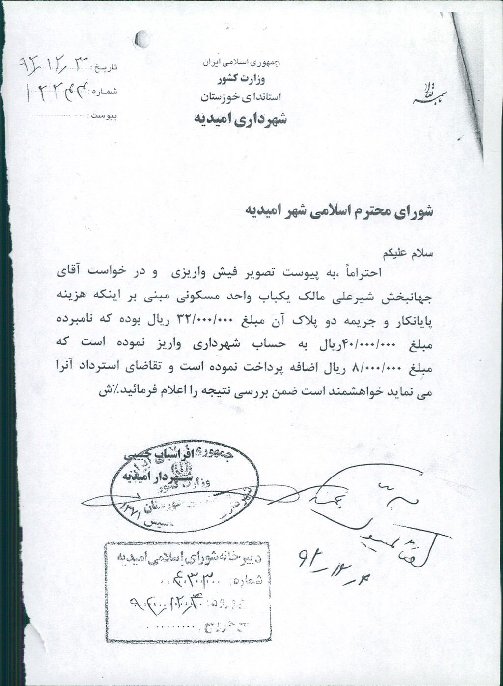 نامه شماره فوق شهرداری در خصوص درخواست استرداد مبلغ ۸۰۰۰۰۰۰ريال وجه اضافۀ پرداخت شده توسط آقای جهانبخش شیرعلی مالک یکباب واحد مسکونی که برای هزینه پایانکار و جریمه دوپلاک می بایست مبلغ ۳۲۰۰۰۰۰۰ريال واریز می نمود و به اشتباه مبلغ۴۰۰۰۰۰۰۰ ريال پرداخت کرده ، در جلسه مطرح و پس از بحث و بررسی با آراء ذیل مصوب گردید%