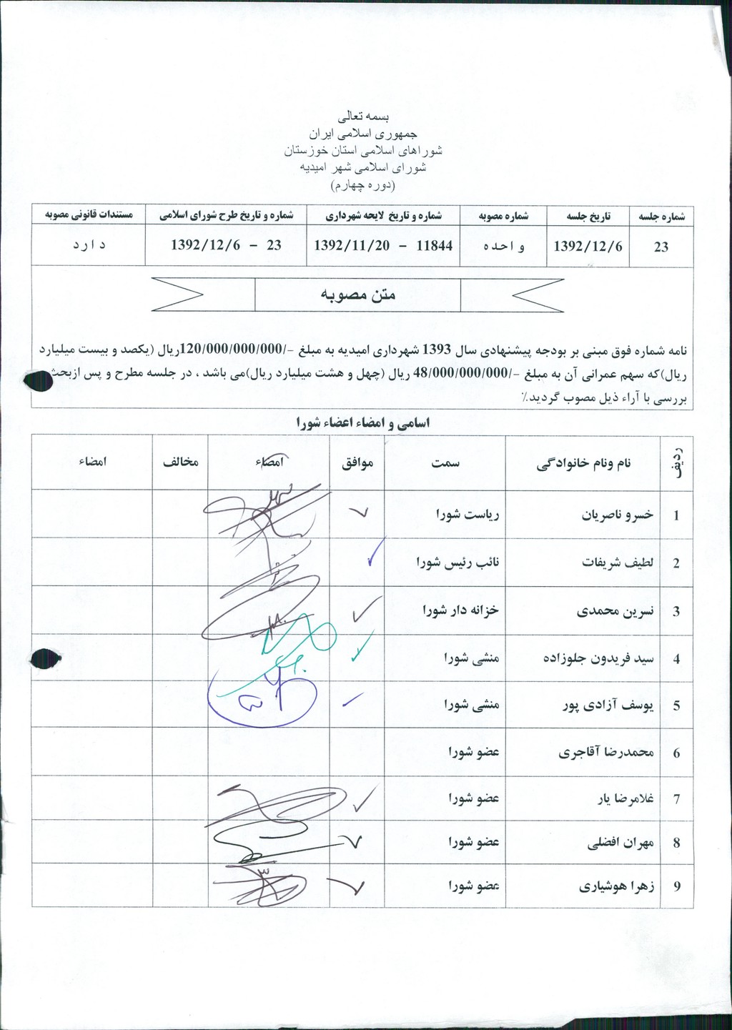 نامه شماره فوق مبنی بر بودجه پیشنهادی سال ۱۳۹۳ شهرداری امیدیه به مبلغ ۱۲۰۰۰۰۰۰۰۰۰۰ریال (یکصد و بیست میلیارد ریال)که سهم عمرانی آن به مبلغ ۴۸۰۰۰۰۰۰۰۰۰ریال (چهل و هشت میلیارد ریال)می باشد ، در جلسه مطرح و پس ازبحث و بررسی با آراء ذیل مصوب گردید%