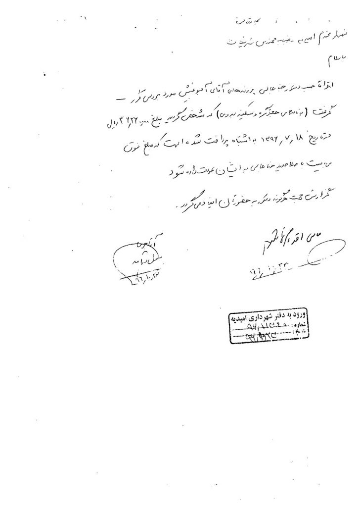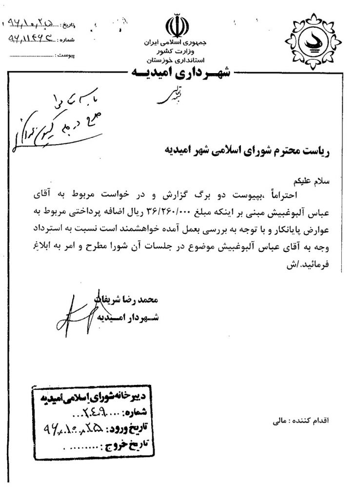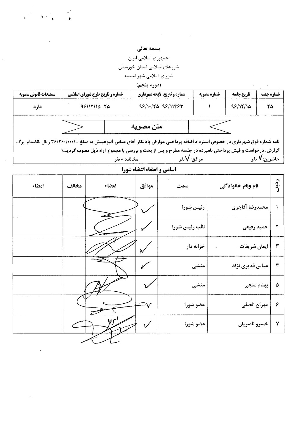 مصوبه شماره ۱ جلسه شماره ۲۵ شورای اسلامی شهر امیدیه