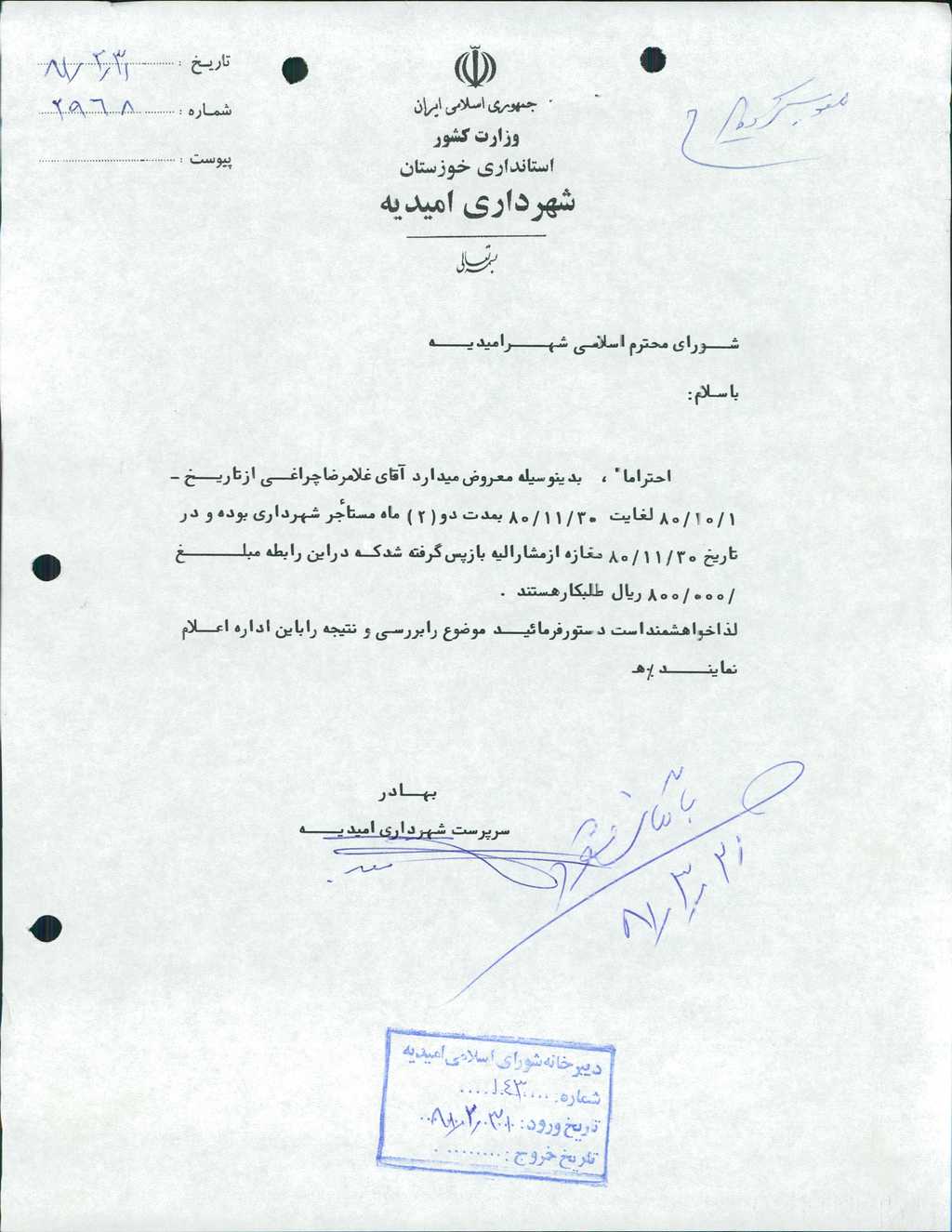۱-نامه شماره ۲۹۶۸ مورخه۳۱/ ۲/ ۸۱ شهرداري در خصوص آقـاي غلامرضا چراغي كه از تاريخ ۱/ ۱۰/ ۸۰لغايت۳۰/ ۱۱/ ۸۰به مدت ۲ماه مستأجر يك باب مغازه شهرداري بوده قرائت گرديد،لذا بـا توجه به پرداخت۱۲۰۰۰۰۰ريال حق اجــاره ۶ ماهه از طرف مستأجر در وجه شهـرداري،پس از بحث وبررسي پيرامون موضوع با ۶ رأي موافق مقـرر شـد مبلغ۸۰۰۰۰۰ريال در وجه نامبرده پرداخت گردد.
