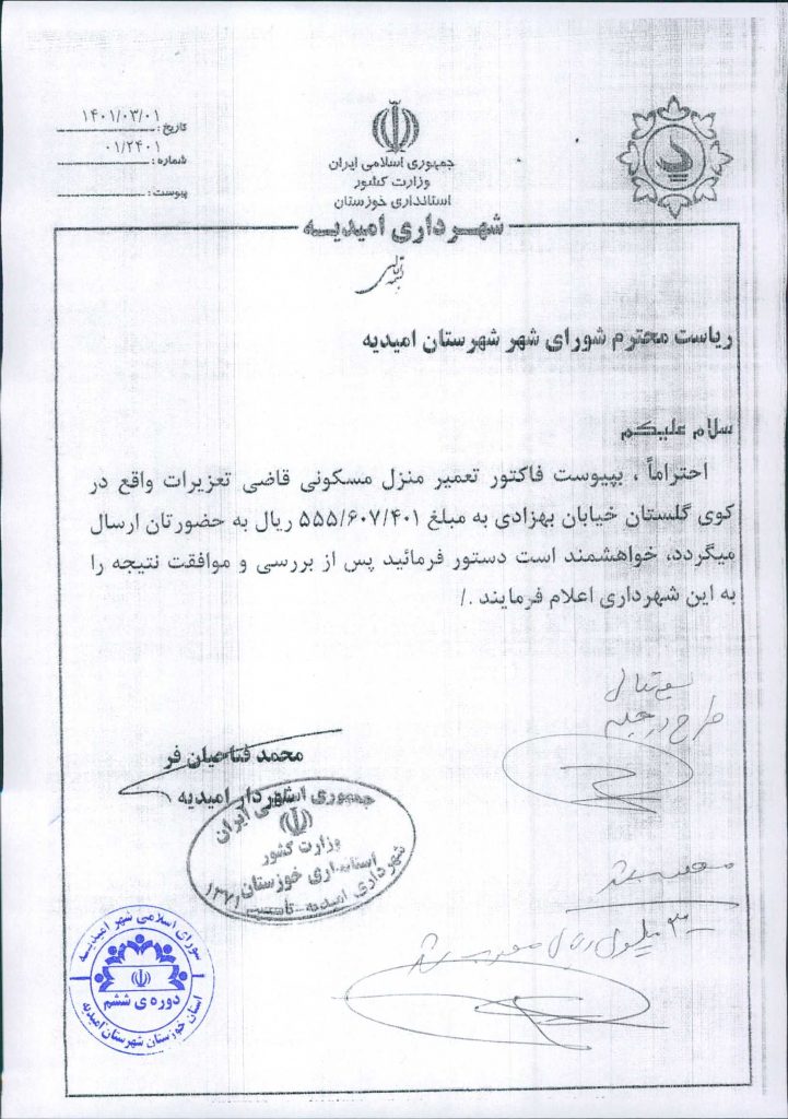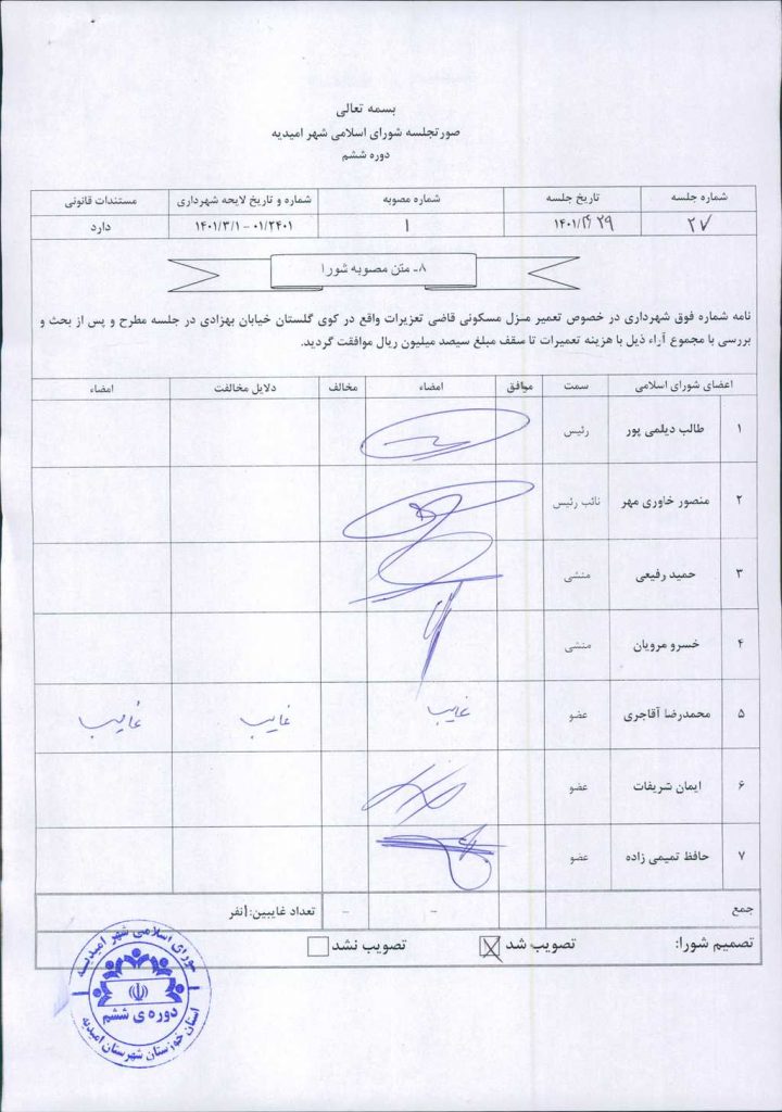 مصوبه شماره ۱ جلسه شماره ۲۷ شورای اسلامی شهر امیدیه