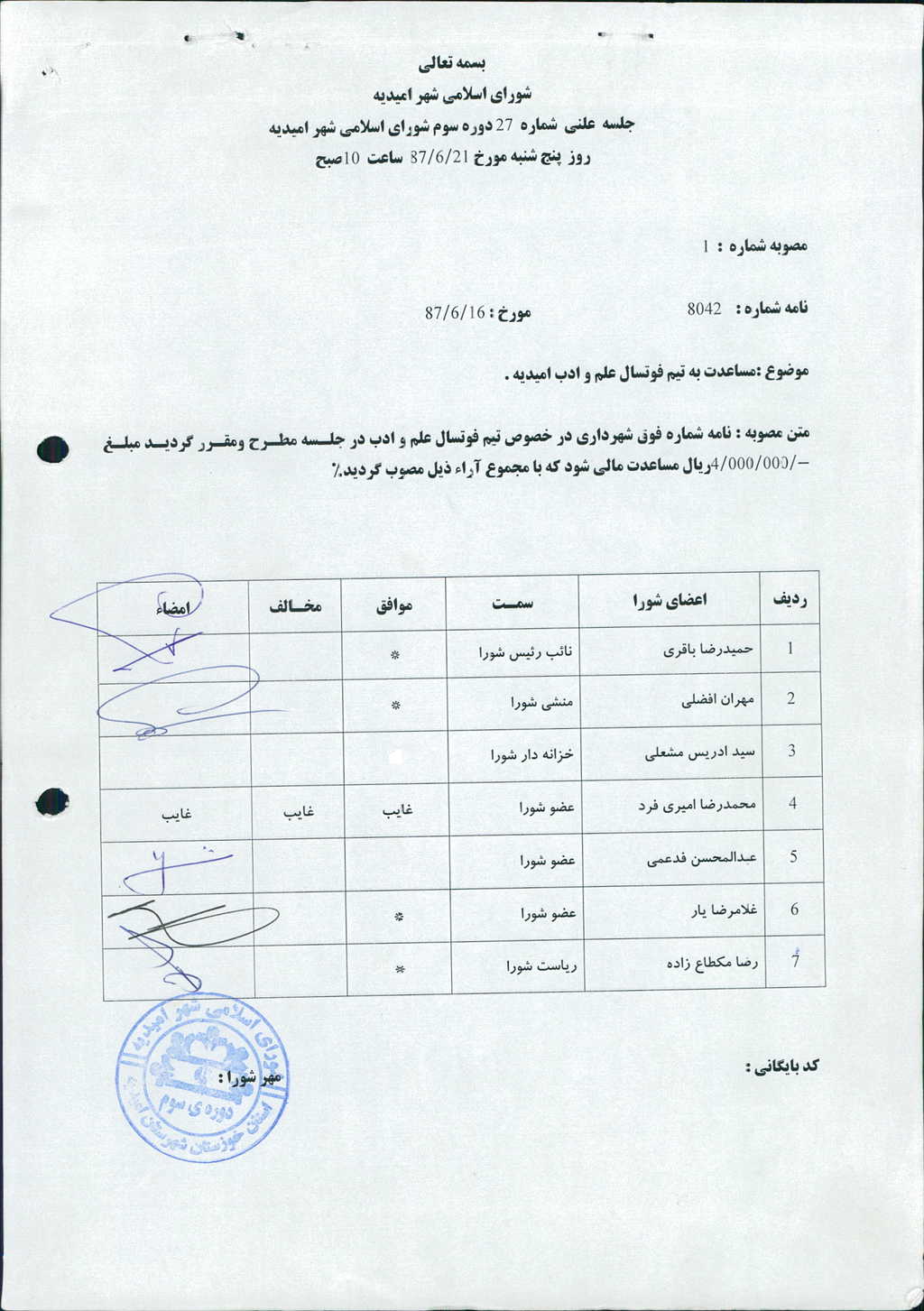 متن مصوبه : نامه شماره فوق شهرداری در خصوص تیم فوتسال علم و ادب در جلسه مطرح ومقرر گردید مبلغ ۴۰۰۰۰۰۰ ريال مساعدت مالی شود که با مجموع آراء ذیل مصوب گردید%