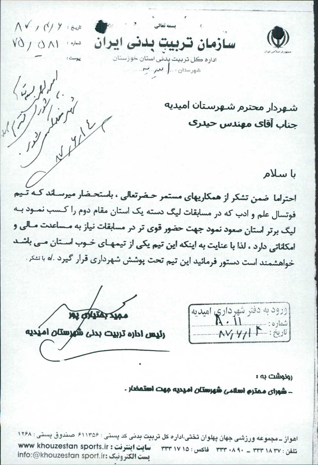 موضوع :مساعدت به تیم فوتسال علم و ادب امیدیه .
