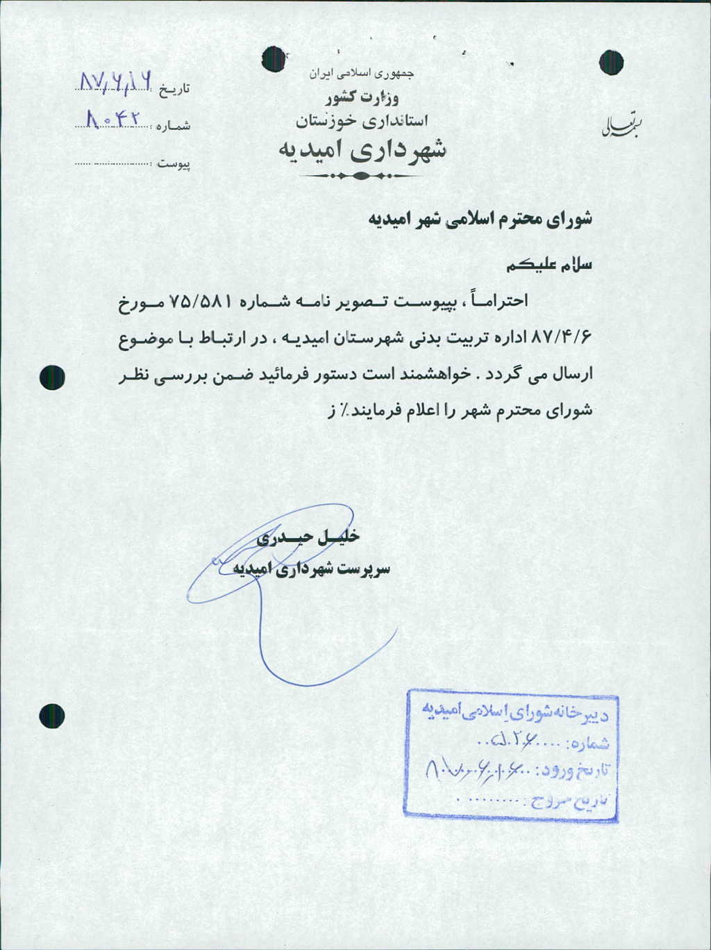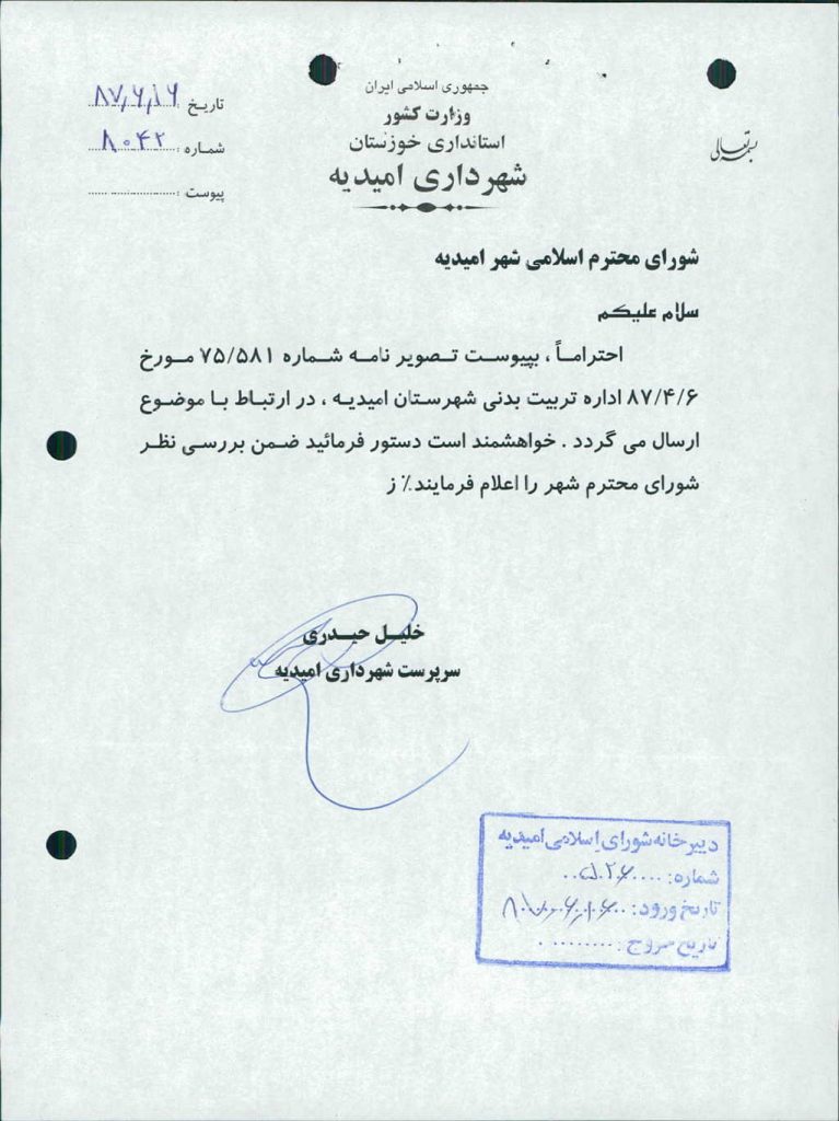 مصوبه شماره ۱ جلسه شماره ۲۷ شورای اسلامی شهر امیدیه