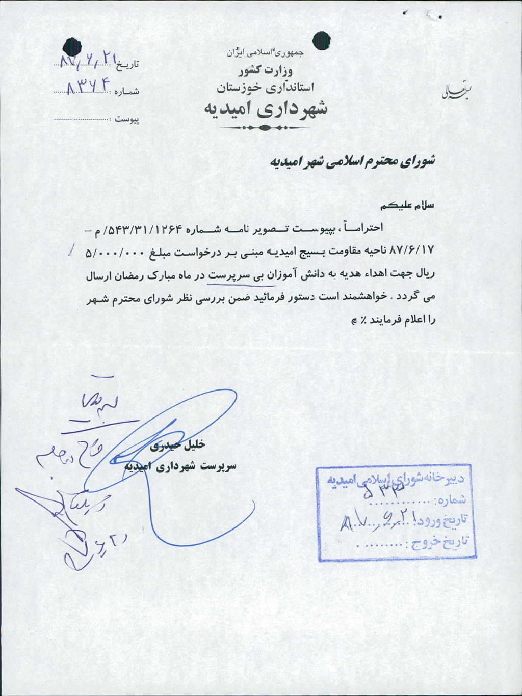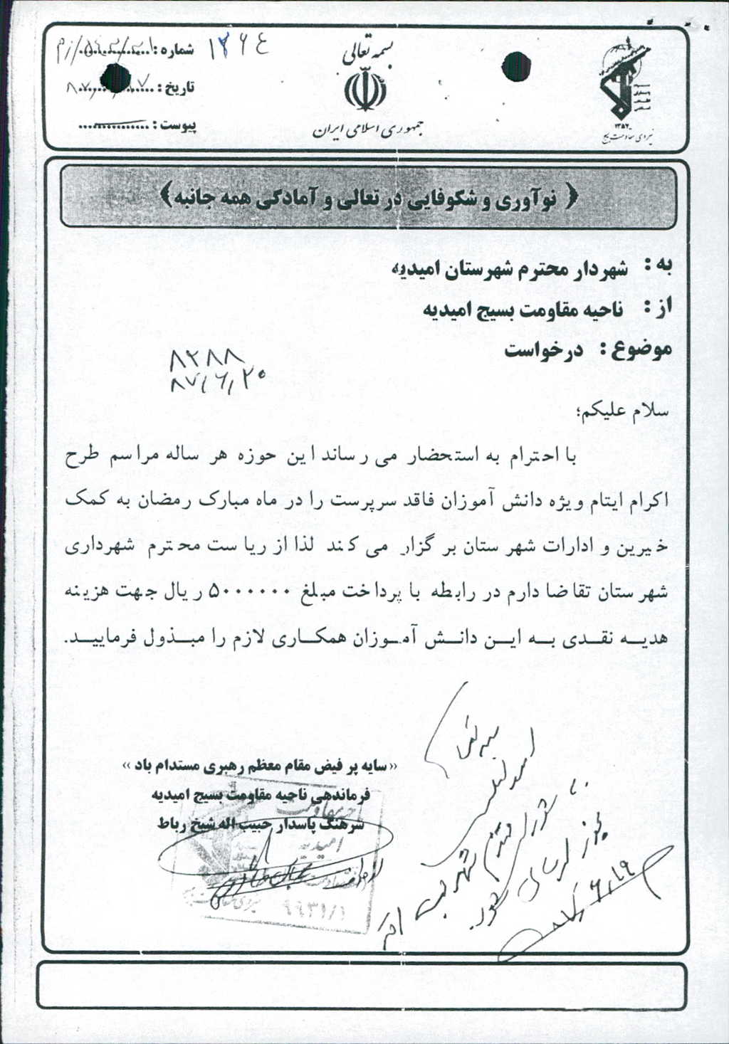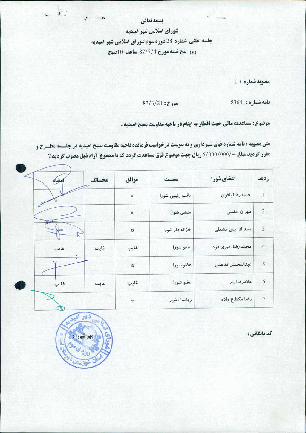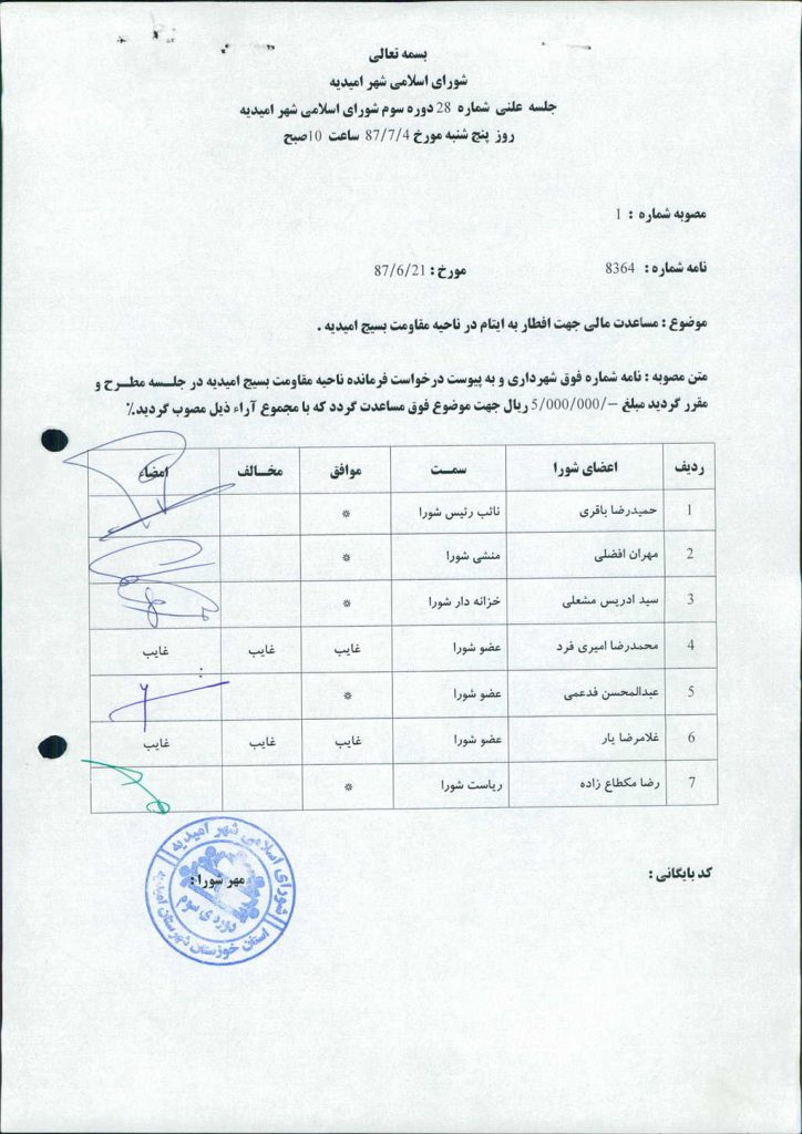 متن مصوبه : نامه شماره فوق شهرداری و به پیوست درخواست فرمانده ناحیه مقاومت بسیج امیدیه در جلسه مطرح و مقرر گردید مبلغ ۵۰۰۰۰۰۰ ریال جهت موضوع فوق مساعدت گردد که با مجموع آراء ذیل مصوب گردید%