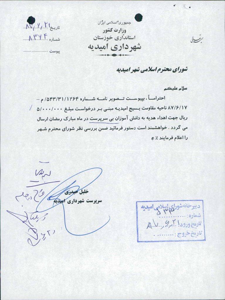 موضوع : مساعدت مالی جهت افطار به ایتام در ناحیه مقاومت بسیج امیدیه .