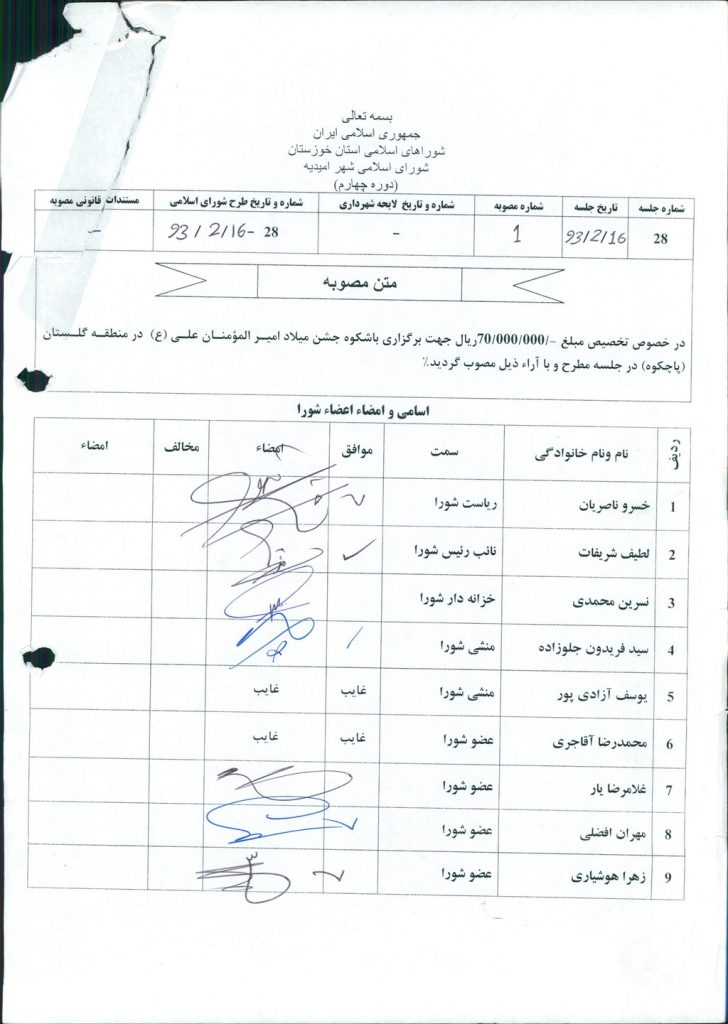 در خصوص تخصیص مبلغ ۷۰۰۰۰۰۰۰ريال جهت برگزاری باشکوه جشن میلاد امیر المؤمنان علی (ع) در منطقه گلستان (پاچکوه) در جلسه مطرح و با آراء ذیل مصوب گردید%