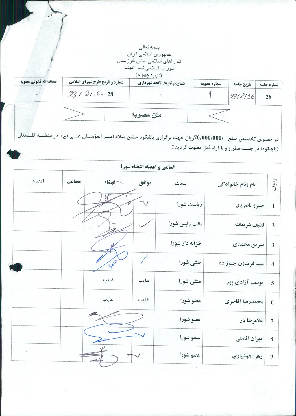 بسم الله الرحمن الرحیم مصوبه شماره ۱ جلسه شماره ۲۸ شورای اسلامی شهر امیدیه