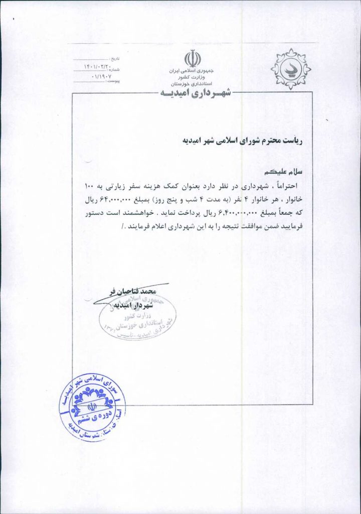 نامه شماره فوق مبنی بر اینکه شهرداری در نظردارد بعنوان کمک هزینه سفر زیارتی به ۱۰۰ خانوار، هرخانوار۴ نفر(به مدت ۴شب ۵روز) جهت هر خانوار مبلغ شصت و چهار میلیون ریال، جمعاً مبلغ شش میلیارد و چهارصد میلیون ریال پرداخت نماید، موضوع در جلسه مطرح و پس از بحث و بررسی با مجموع آراء ذیل مصوب گردید.