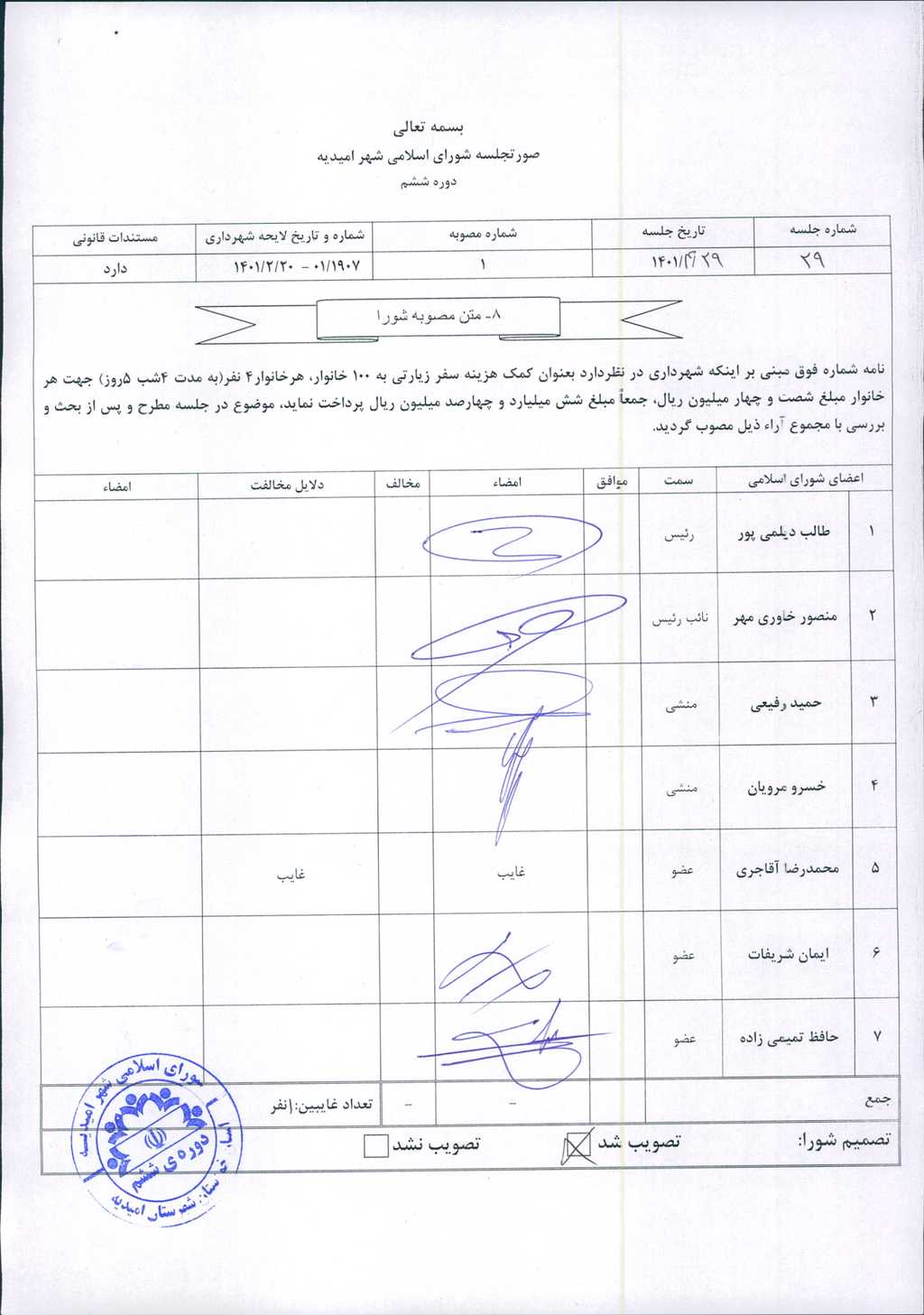 مصوبه شماره ۱ جلسه شماره ۲۹ شورای اسلامی شهر امیدیه
