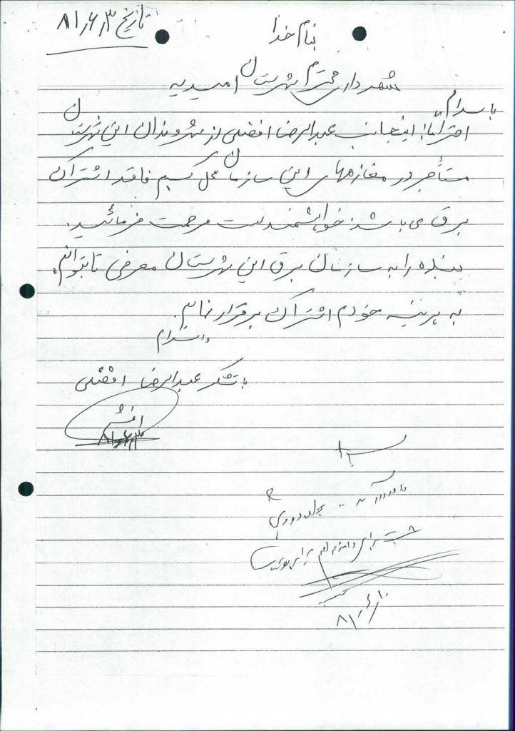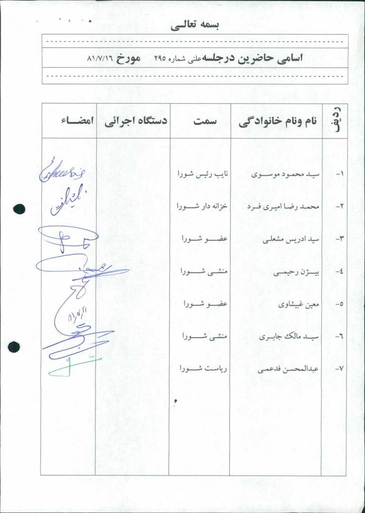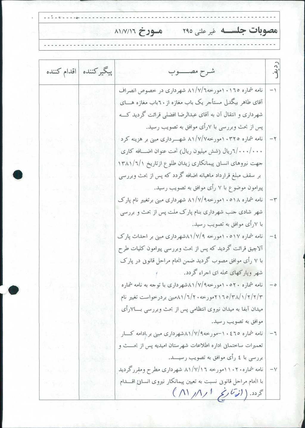 مصوبه شماره ۱ جلسه شماره ۲۹۵ مورخ ۸۱/۷/۱۶ شورای اسلامی شهر امیدیه