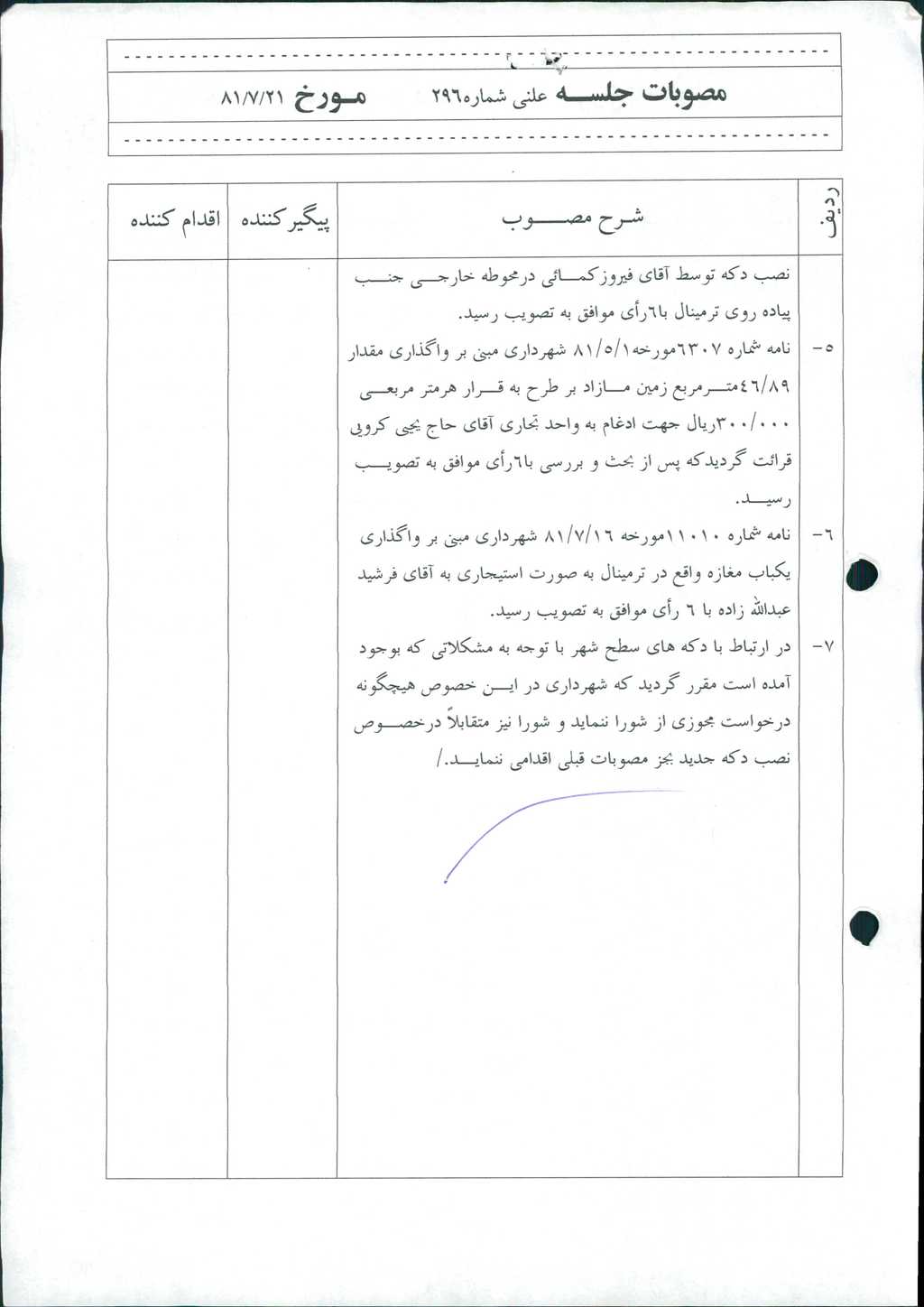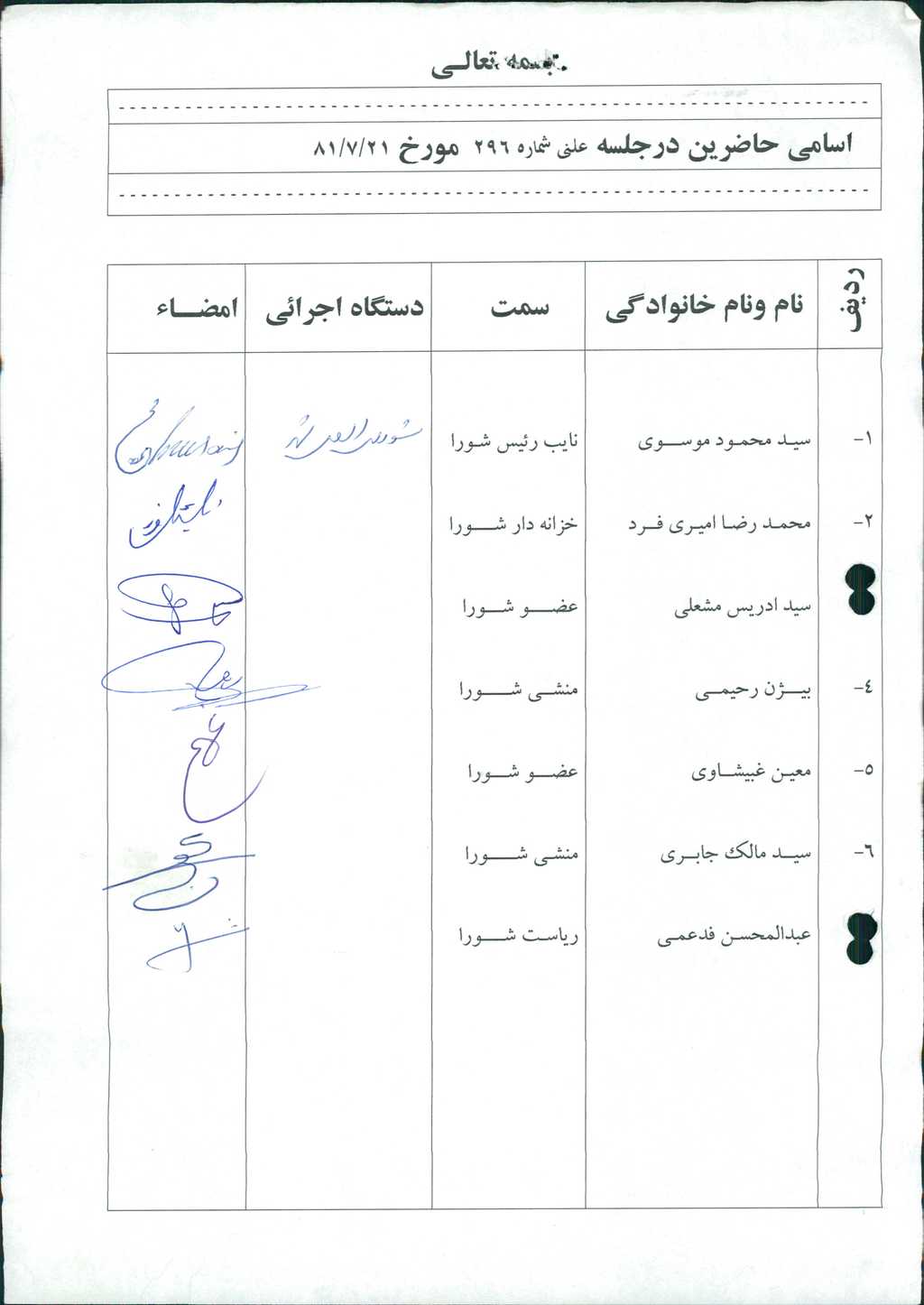 مصوبه شماره ۱ جلسه شماره ۲۹۶ مورخ ۸۱/۷/۲۱ شورای اسلامی شهر امیدیه
