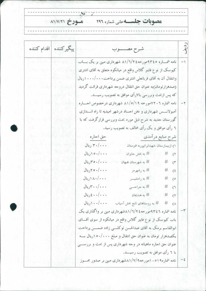مصوبه شماره ۱ جلسه شماره ۲۹۶ شورای اسلامی شهر امیدیه