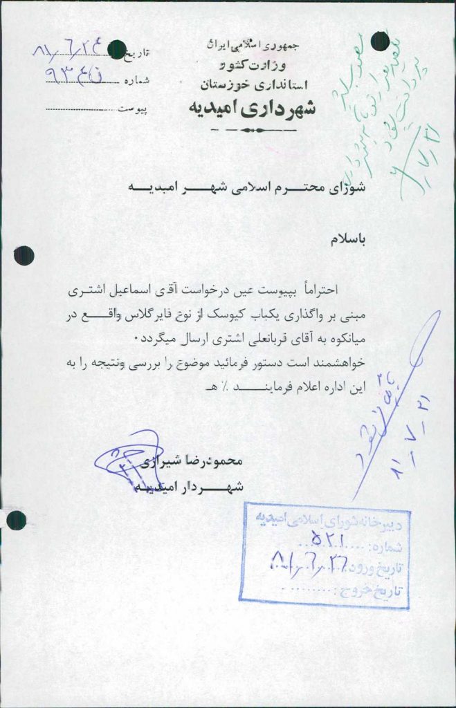 ۱-نامه شمـاره ۹۳۴۵مورخه۲۴ /۶/ ۸۱ شهرداري مبني بر يك بـاب كيوسك از نوع فايبر گلاس واقع در ميانكوه متعلق به آقاي اشتري وانتقال آن به آقاي قربانعلي اشتري ضمن پرداخت۰۰۰/ ۱/۰۰۰ريال(صدهزارتومان)به عنوان حق انتقال دروجه شهرداري قرائت گرديدكه پس ازبحث وبررسي با۷رأي موافق به تصويب رسيـد.