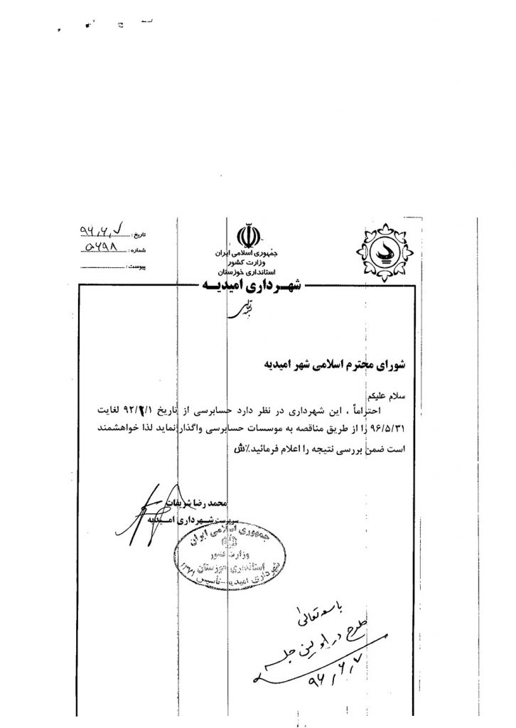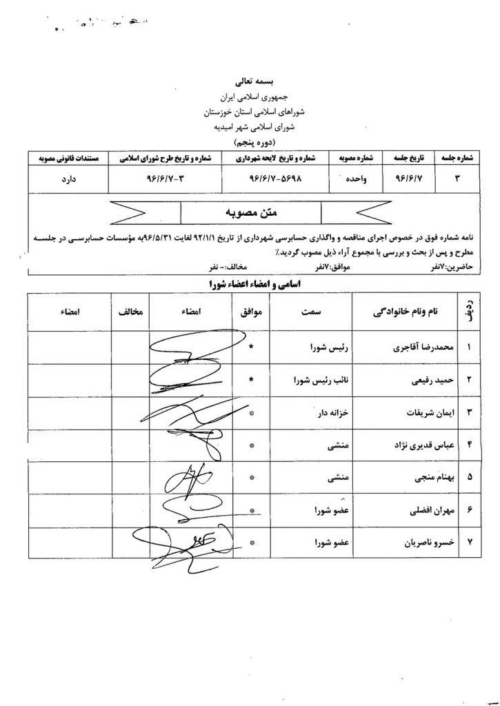 مصوبه شماره ۱ جلسه شماره ۳ شورای اسلامی شهر امیدیه