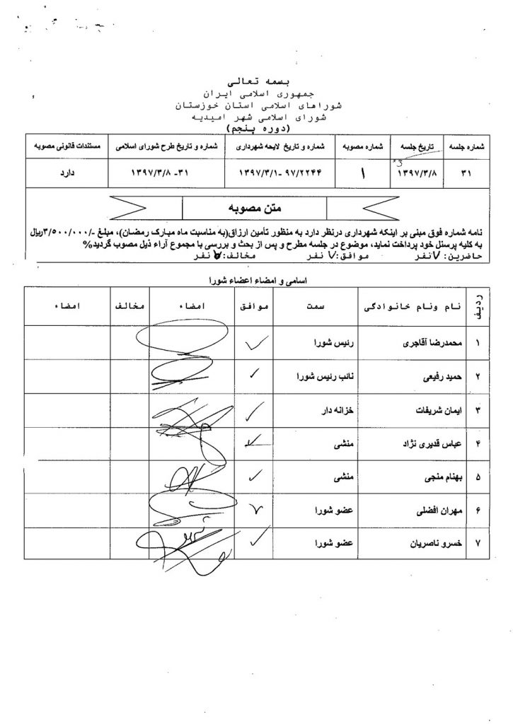 مصوبه شماره ۱ جلسه شماره ۳۰ شورای اسلامی شهر امیدیه