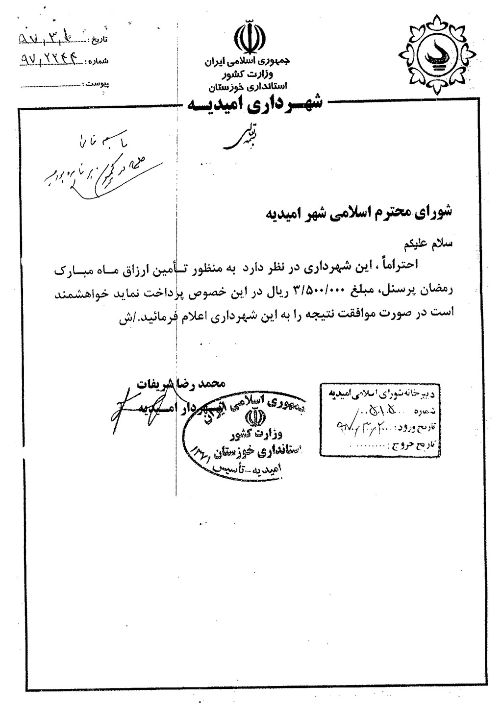 نامه شماره فوق مبنی بر اینکه شهرداری درنظر دارد به منظور تأمین ارزاق(به مناسبت ماه مبارک رمضان)، مبلغ ۳۵۰۰۰۰۰ريال به هر نفر از پرسنل خود پرداخت نماید، موضوع در جلسه مطرح و پس از بحث و بررسی با مجموع آراء ذیل مصوب گردید%