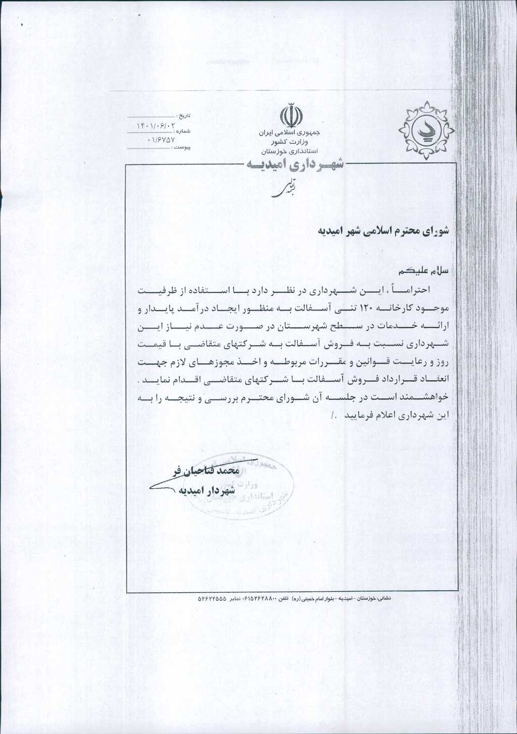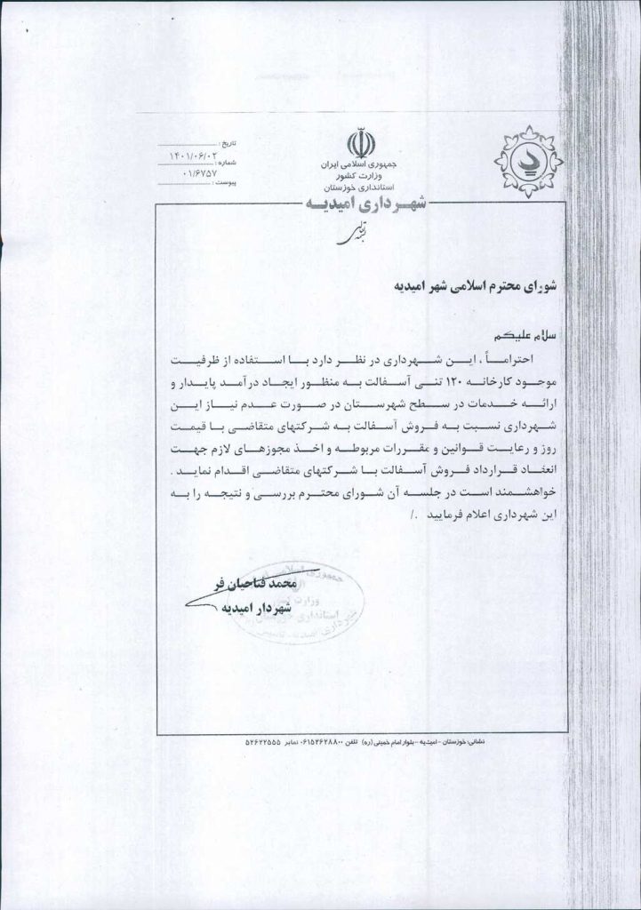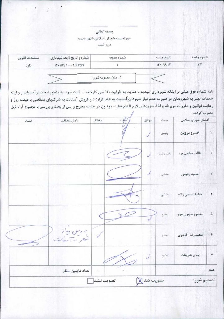 نامه شماره فوق مبنی بر اینکه شهرداری امیدیه،با عنایت به ظرفیت۱۲۰ تنی کارخانه آسفالت خود، به منظور ایجاد درآمد پایدار و ارائه خدمات بهتر به شهروندان در صورت عدم نیاز شهرداری، نسبت به عقد قرارداد و فروش آسفالت به شرکتهای متقاضی با قیمت روز و رعایت قوانین و مقررات مربوطه و اخذ مجوزهای لازم اقدام نماید، موضوع در جلسه مطرح و پس از بحث و بررسی با مجموع آراء ذیل مصوب گردید.