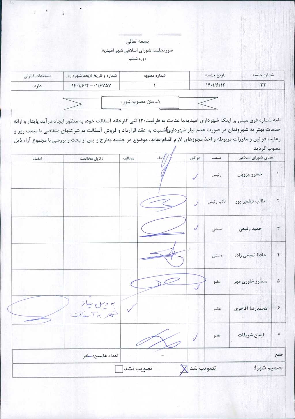 مصوبه شماره ۱ جلسه شماره ۳۲ شورای اسلامی شهر امیدیه