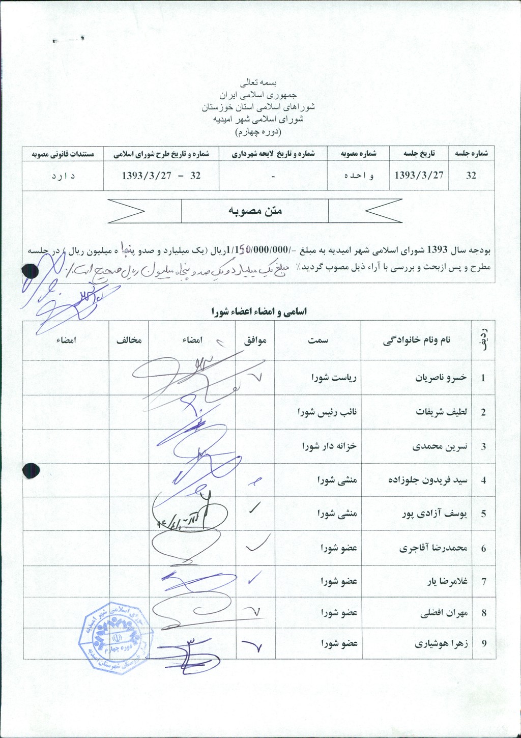 مصوبه شماره ۱ جلسه شماره ۳۲ مورخ ۹۳/۳/۲۷ شورای اسلامی شهر امیدیه