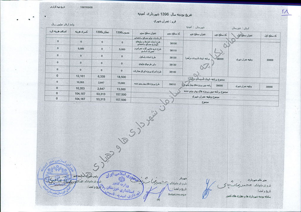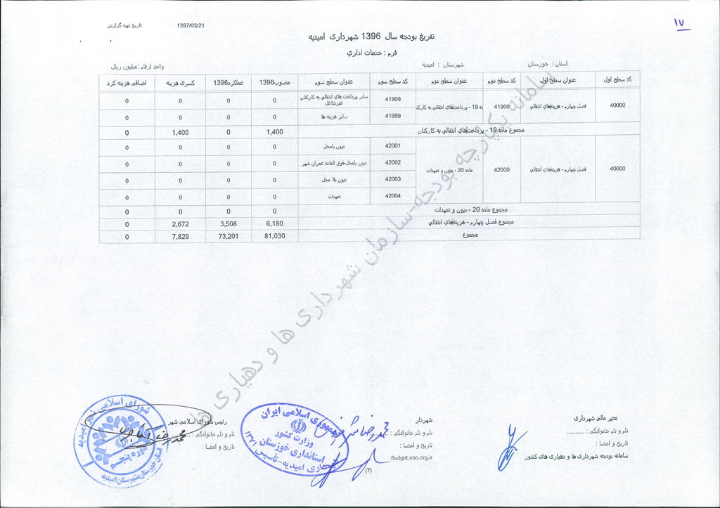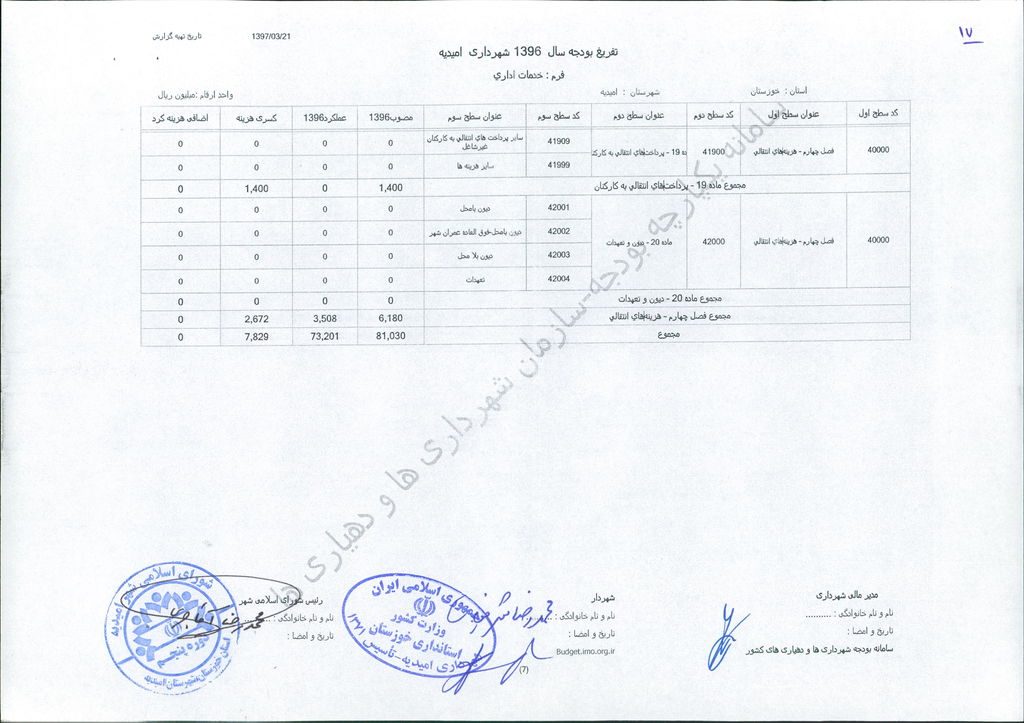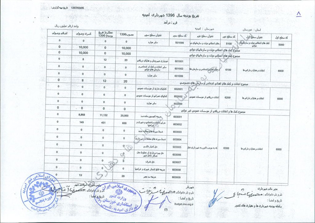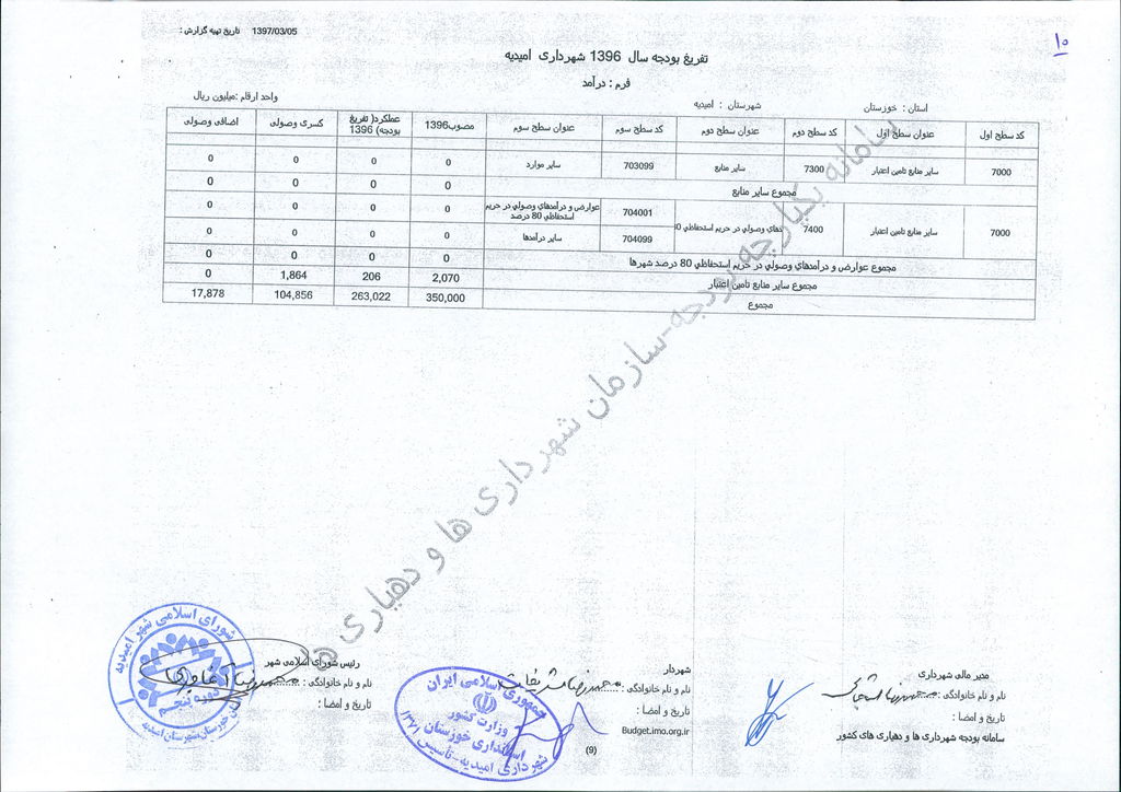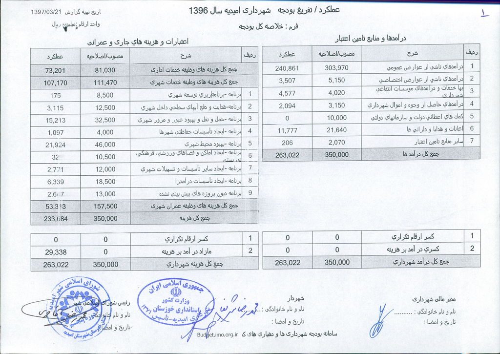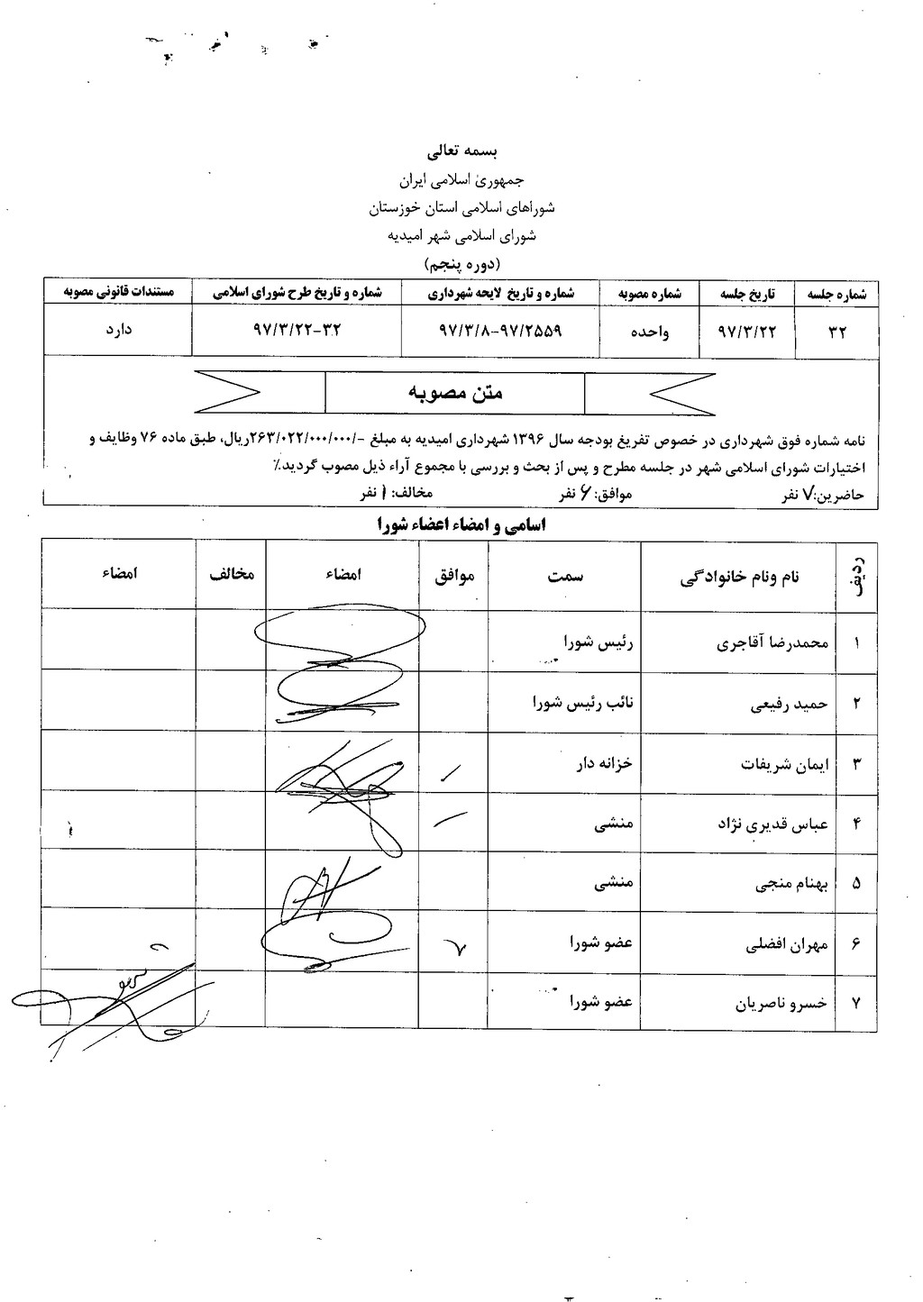 نامه شماره فوق شهرداری در خصوص تفریغ بودجه سال ۱۳۹۶ شهرداری امیدیه به مبلغ ۲۶۳۰۲۲۰۰۰۰۰۰ ريال، طبق ماده ۷۶ وظایف و اختیارات شورای اسلامی شهر در جلسه مطرح و پس از بحث و بررسی با مجموع آراء ذیل مصوب گردید%