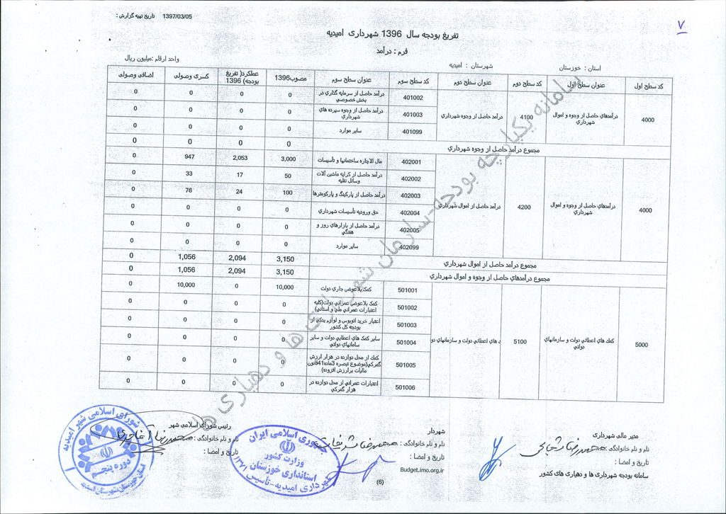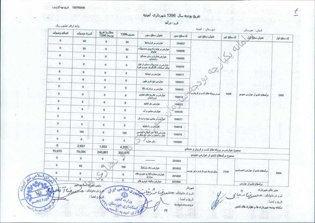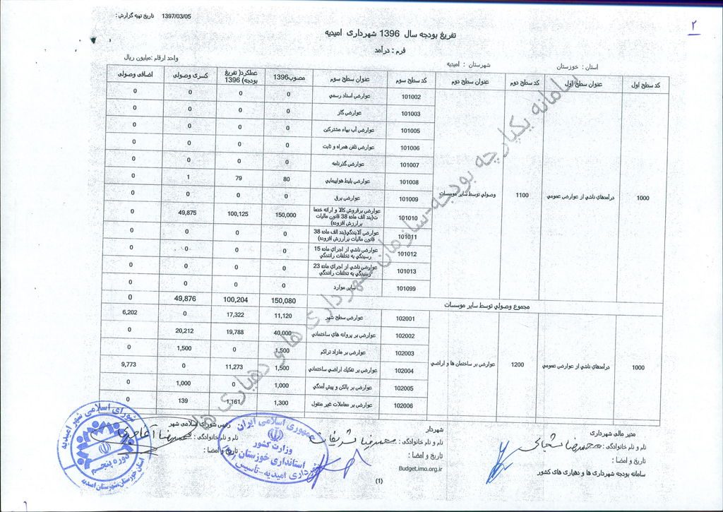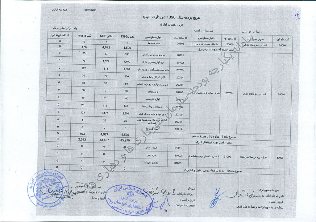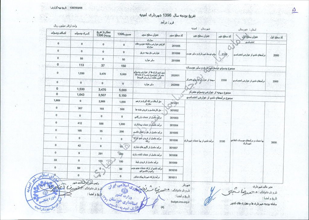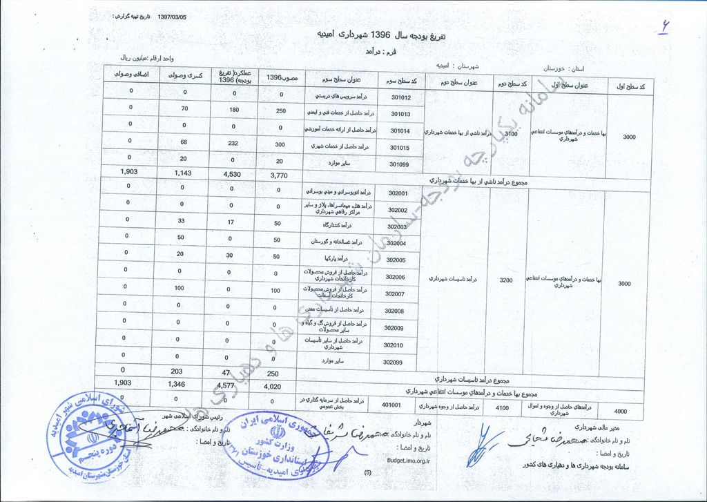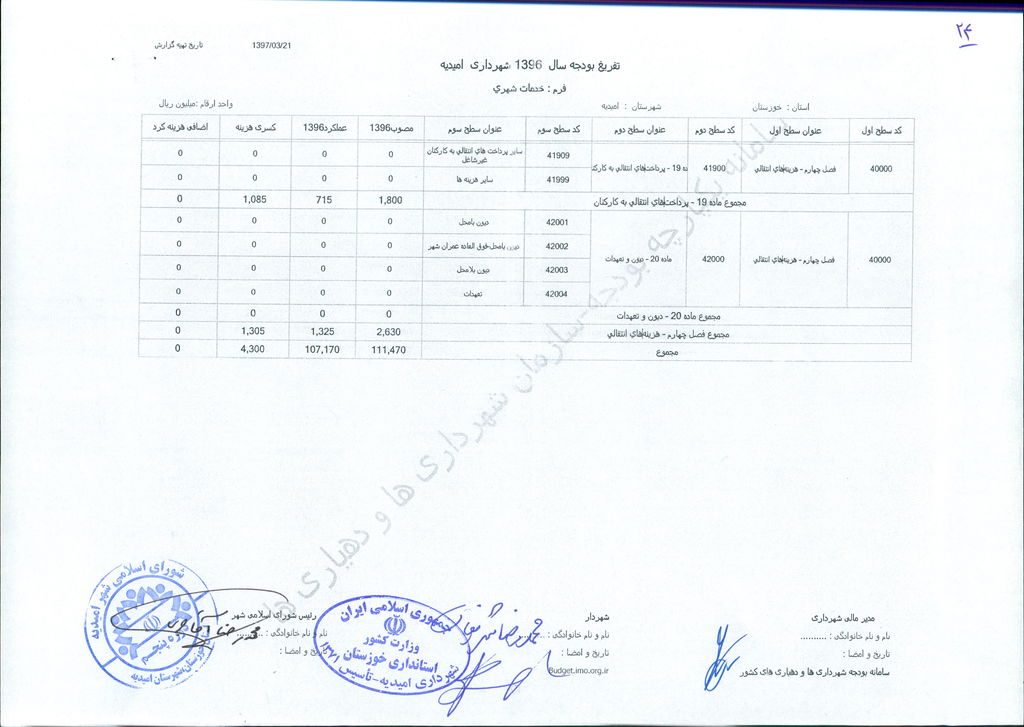 نامه شماره فوق شهرداری در خصوص تفریغ بودجه سال ۱۳۹۶ شهرداری امیدیه به مبلغ ۲۶۳۰۲۲۰۰۰۰۰۰ ريال، طبق ماده ۷۶ وظایف و اختیارات شورای اسلامی شهر در جلسه مطرح و پس از بحث و بررسی با مجموع آراء ذیل مصوب گردید%