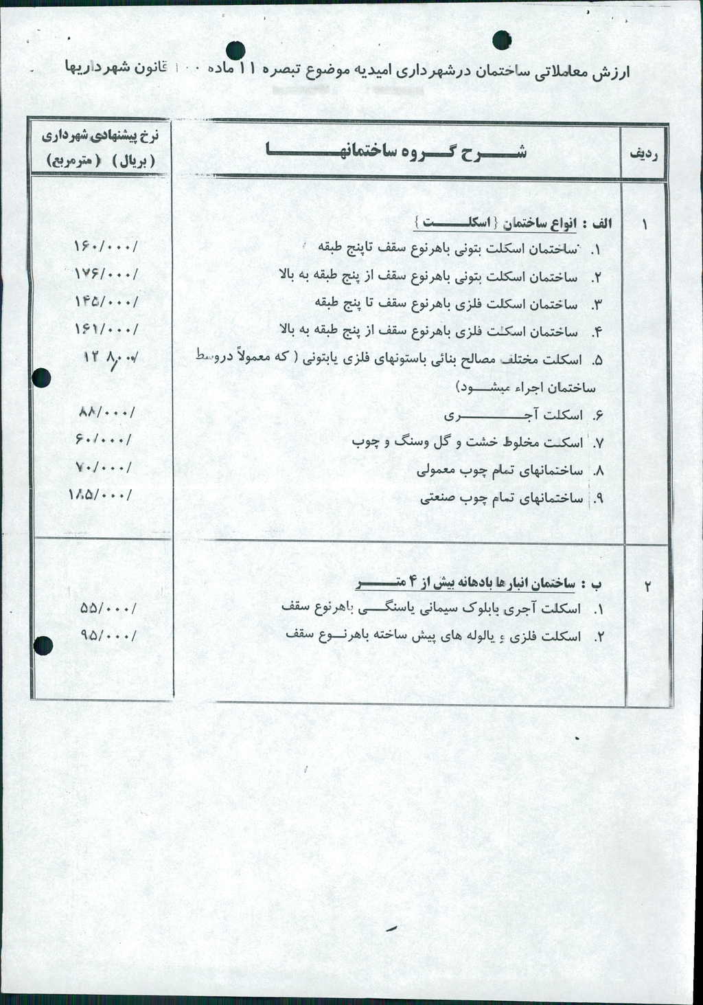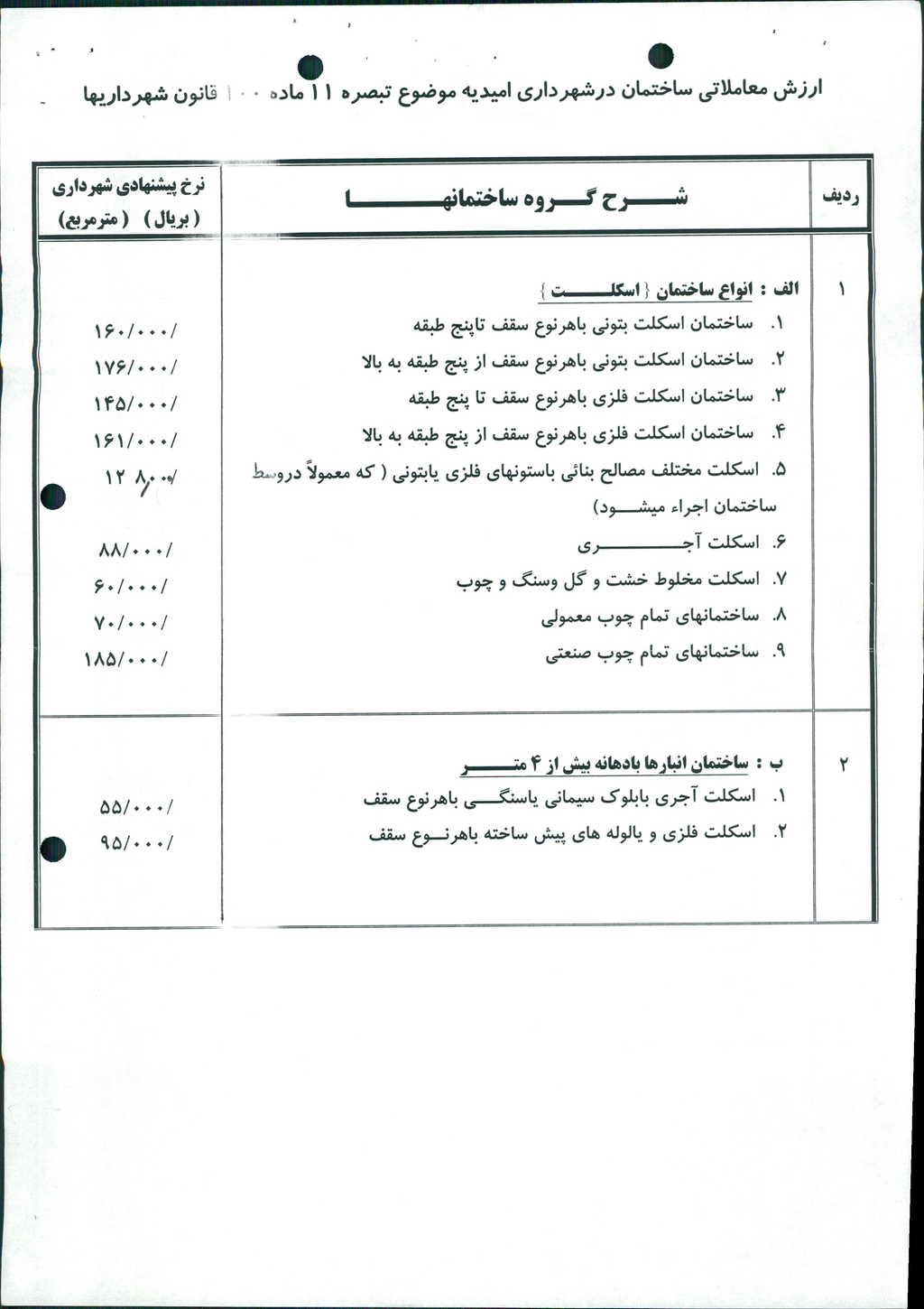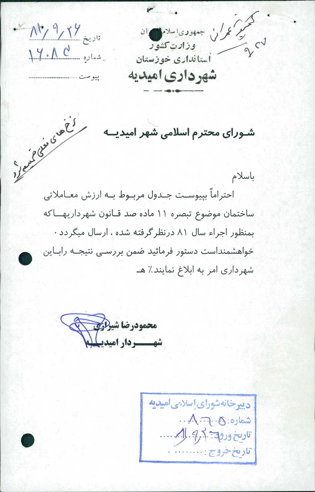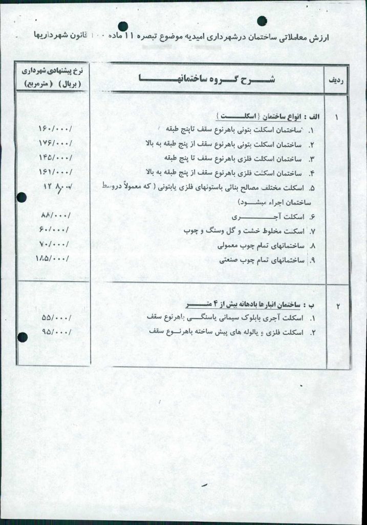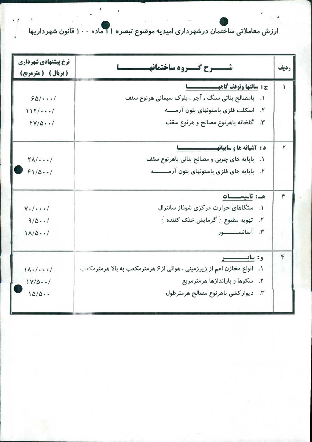 ۱- نامه شماره۱۶۰۸۳-۲۶/ ۹/ ۸۱ شهرداري مبني بر جدول مربوط به ارزش معاملاتي ساختمان موضوع تبصره ۱۱ماده صدقانون شهرداريها به منظورسال ۸۲ قرائت گرديد وبا ۵رأي موافق به تصويب رسيد.